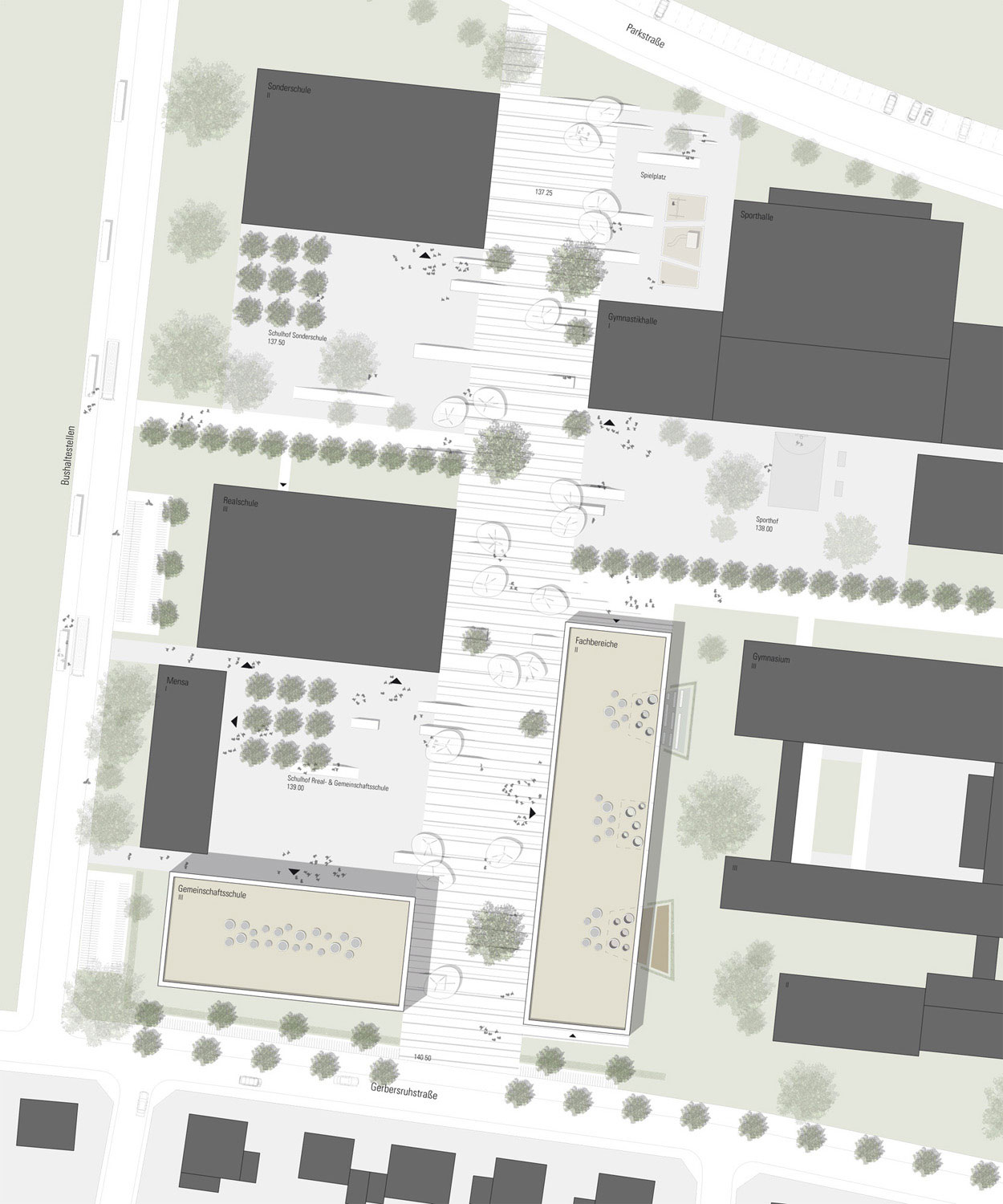 Die momentan unübersichtliche Situation auf dem Campus wird neu geordnet. Die Fluchten der unterschiedlichen Bestandsschulen werden aufgenommen und durch die neue Gemeinschaftsschule (GMS) gefasst. Es werden für jede Schule großzügige, wohlproportionierte Pausenhöfe ausgebildet und kleinteilige Restflächen vermieden.
