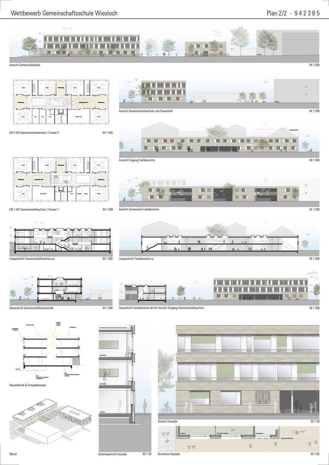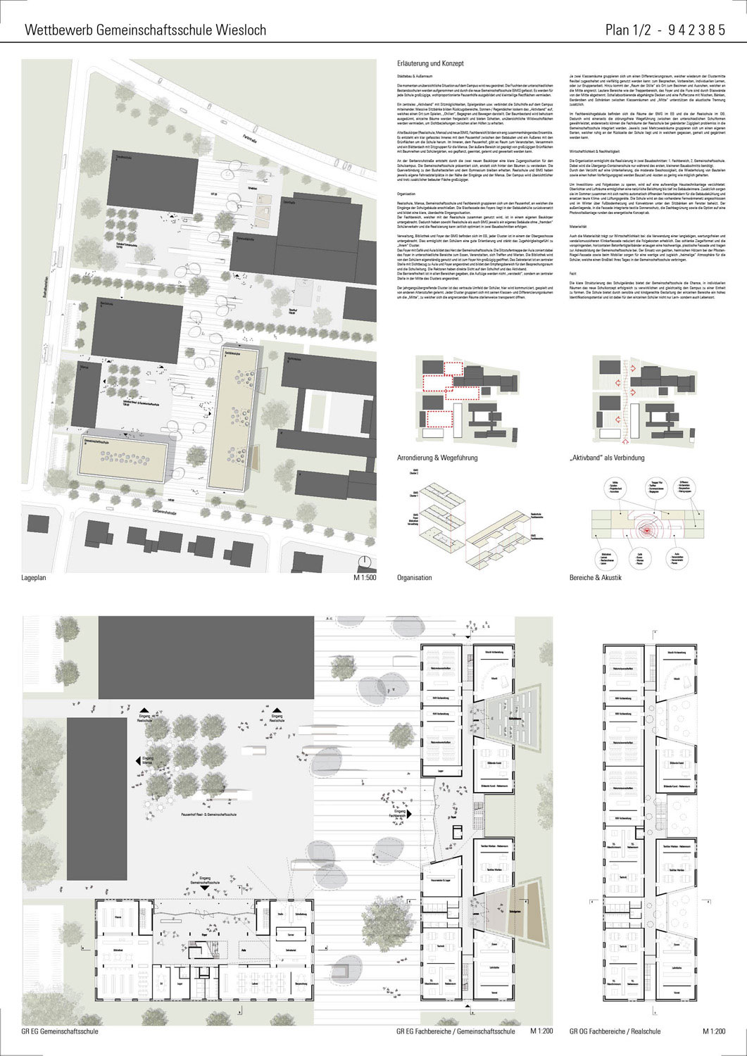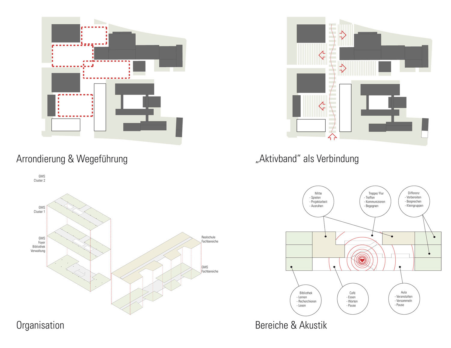 Der Verfasser schlägt zwei Gebäude vor, die sich an dem nord-süd verlaufenden sogenannten „Aktivband“ angegliedert, welches die verschiedenen vorhandenen Schulhöfe miteinander verbindet und Richtung Süden fortführt. Die vorgeschlagenen Bauten werden sensibel in das Gebäudegefüge platziert und nehmen die vorhandenen Gebäudekanten der umliegenden Schulgebäude konsequent auf.