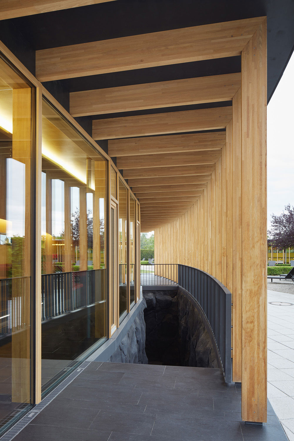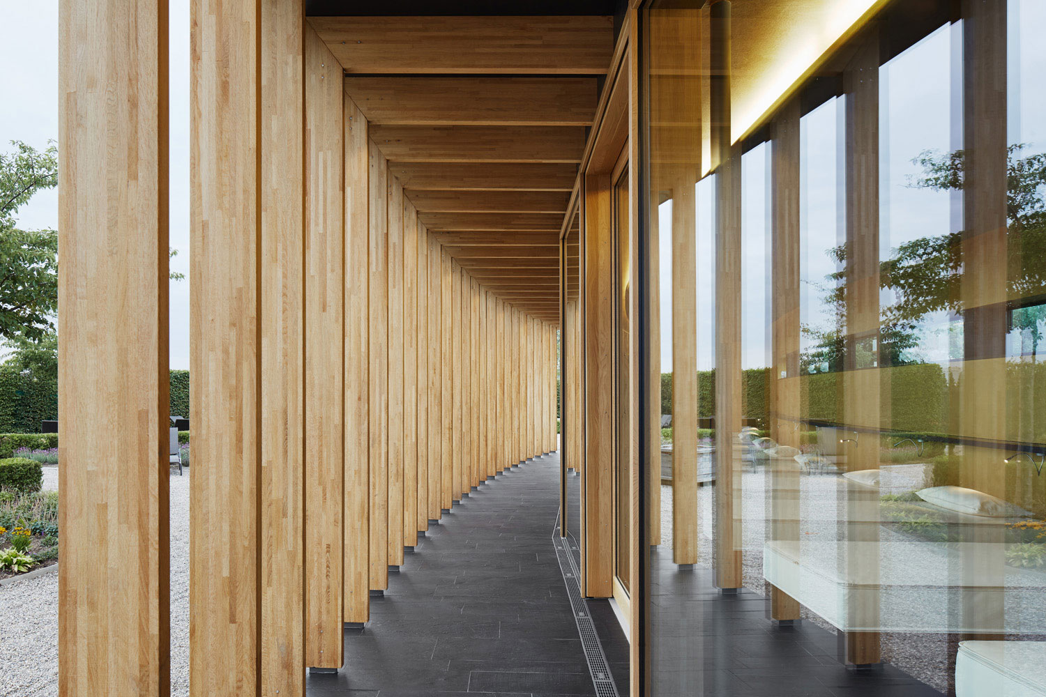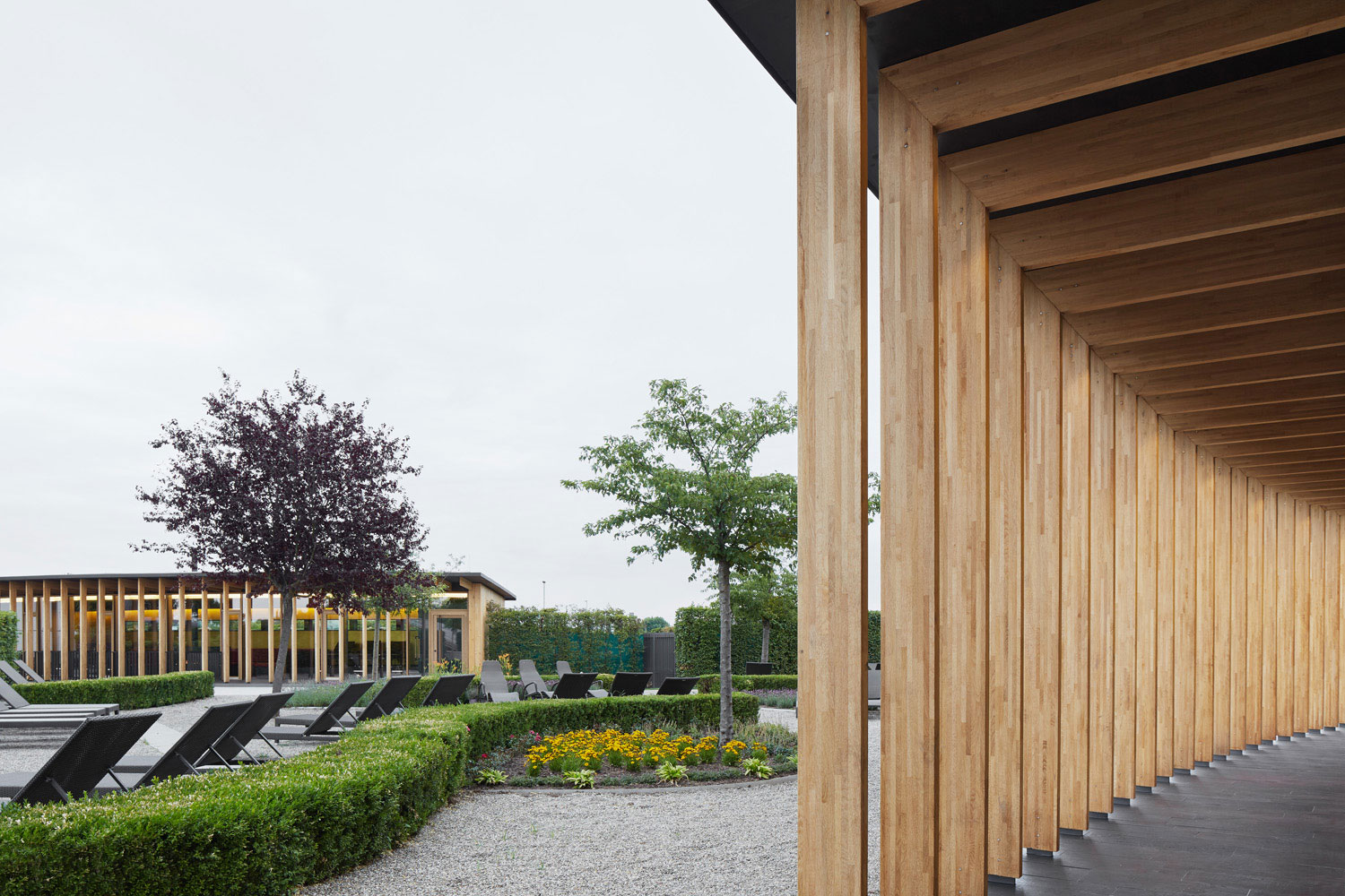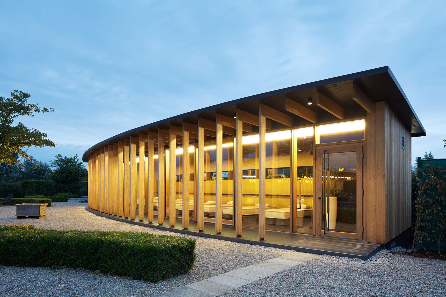Dass ein Gebäude innerhalb einer Saunalandschaft als Holzbau konstruiert wird, stand für uns nicht in Frage. Es entstand ein Holzrahmenbau, der sich zum Garten hin skeletthaft auflöst. Durch die Krümmung der Gebäude und den vorgelagerten Arkadengang entsteht ein Zwischenraum, der nicht nur Sonne, sondern auch Blicke filtert. Trotz der Vollverglasung zum Garten fühlt man sich geborgen.