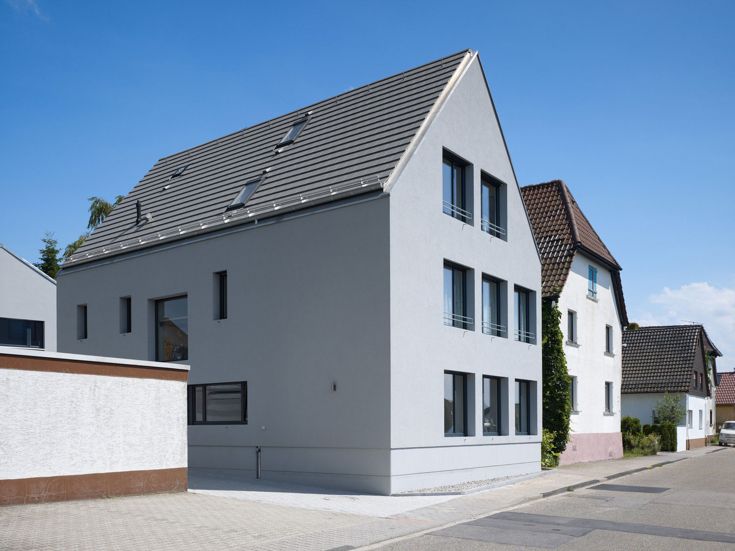 Auf dem schmalen, langen Grundstück im Ortskern von Rheinstetten stand ein sanierungsbedürftiger Altbau. Der Bebauungsplan ließ ein Vorder- und ein Rückgebäude zu, jedoch mit der Auflage, dass das Vorderhaus genau an der gleichen Stelle stehen musste wie der zum Abriss freigegebene Altbau.