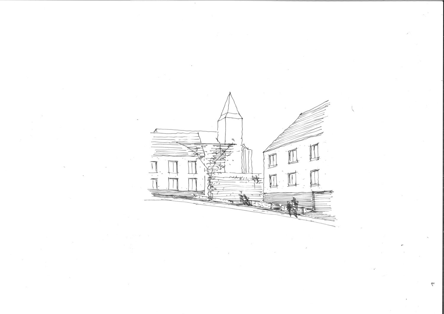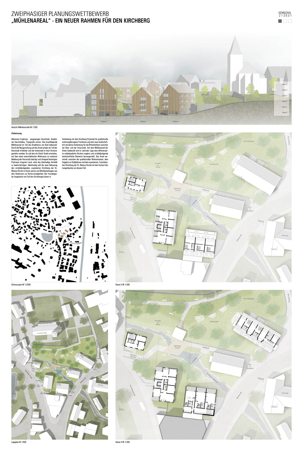 Behutsam ergänzen, ausgewogen vermitteln, Qualitäten hervorheben, Topografie nutzen. Das brachliegende Mühlenareal ist Teil des Stadtkerns von Bad Liebenzell. Durch die Neugestaltung soll das Areal wieder als Teil der Kernstadt erfahrbar und die Innenstadt in ihrer Struktur gestärkt werden. Es soll also ein Stück Stadt entstehen, auf dem neuer innerstädtischer Wohnraum zur weiteren Belebung der Kernstadt beiträgt und dringend benötigter Parkraum integriert wird, ohne das kleinteilige Ortsbild zu beeinträchtigen. Gleichzeitig soll die neue Bebauung den ortsbildprägenden, exponierten Kirchhang der St. Blasius Kirche in Szene setzen und Blickbeziehungen aus dem Stadtraum zur Kirche ermöglichen. Der freizulegende Lengenbach am Fuß des Kirchhanges bietet in Verbindung mit dem Kirchberg Potential für qualitätvolle wohnungsbezogene Freiräume und eine neue landschaftlich attraktive Verbindung für die Öffentlichkeit zwischen der Ober- und der Unterstadt. Auf dem Mühlenareal der Stadt Liebenzell wird in zentraler Lage eine differenzierte städtebauliche Struktur ergänzt und ortsbildprägende landschaftliche Elemente werden hervorgestellt. Das Areal vermittelt zwischen der qualitätvollen Wohnsituation, dem Angebot an Stellplätzen und dem exponierten, freistehenden Kirchhang der St. Blasius Kirche mit dem Verlauf des Lengenbaches an dessen Fuß.