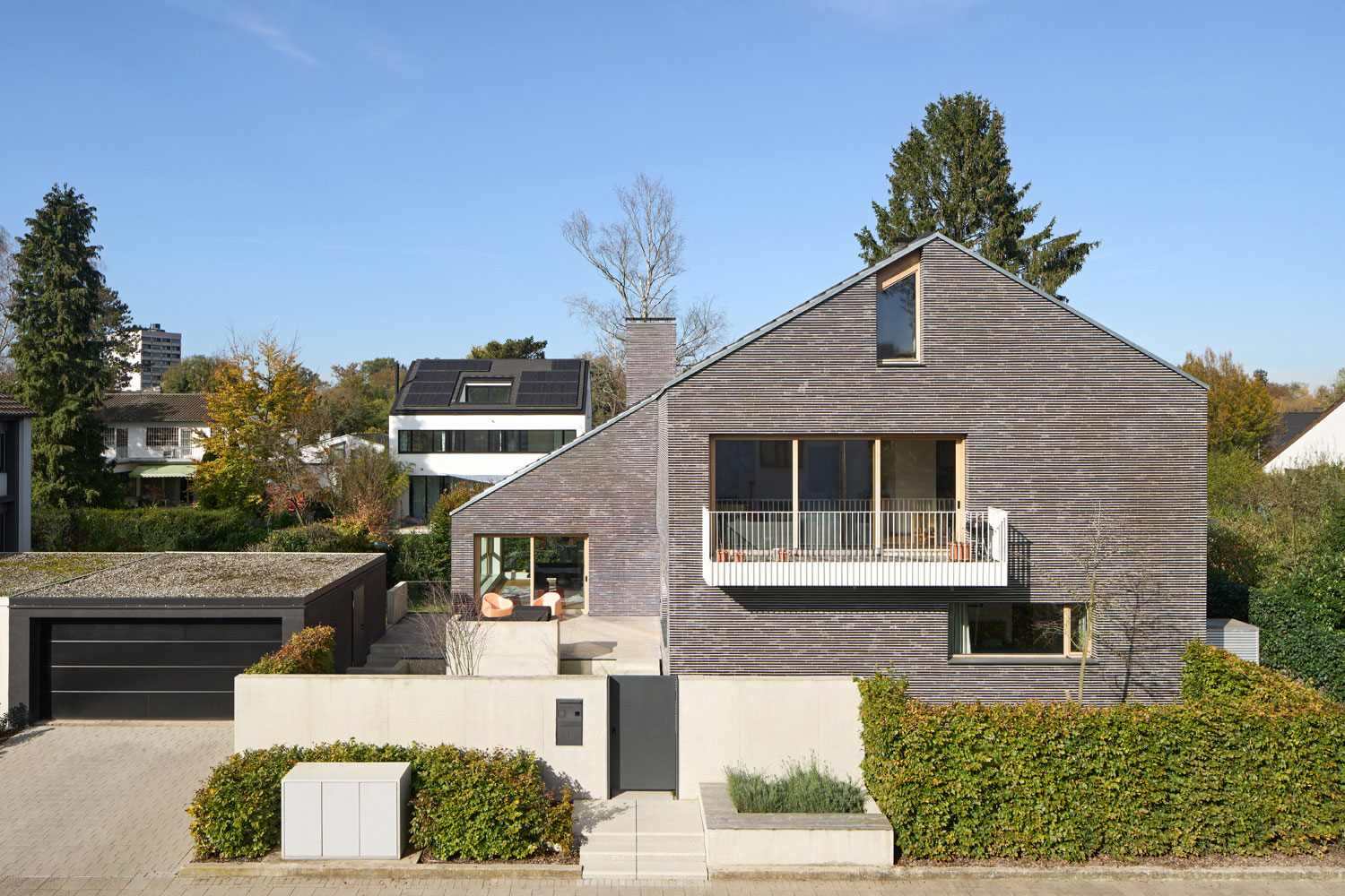 Die Fassade wurde ganz besonders gestaltet. Es wurde eine schwarze Klinkeroberfläche im Langformat errichtet, wobei die Lagerfugen weiß und die Stoßfugen schwarz verfugt wurden. Somit entstanden nur horizontale, helle Linien, was dem Gebäude eine besondere Eleganz verschafft. Diese Klinkerfassade wurde mit geölten Fenstern aus Eichenholz veredelt. Das geneigte Dach verblieb in seiner Satteldachform, wurde jedoch technisch und gestalterisch optimiert. Innenliegende Regenrinnen und Fallrohre, Dachränder aus Metall lassen den Baukörper klar, scharfkantig und modern wirken, ohne den Charakter eines Hauses aus den 60ern zu verstecken.