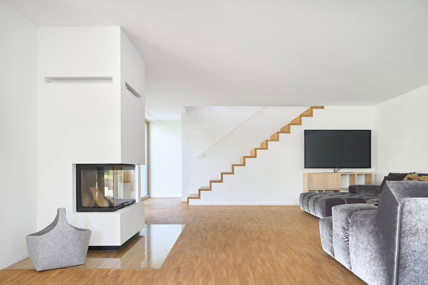 Der größte Eingriff im Innern war das Versetzen der internen Wohnungstreppe und das Rückbauen des Hallenbades im Untergeschoss. Alle weiteren räumlichen Veränderungen waren mit nichttragenden Bauteilen verbunden, insofern hielten sich die Rohbauarbeiten in Grenzen.