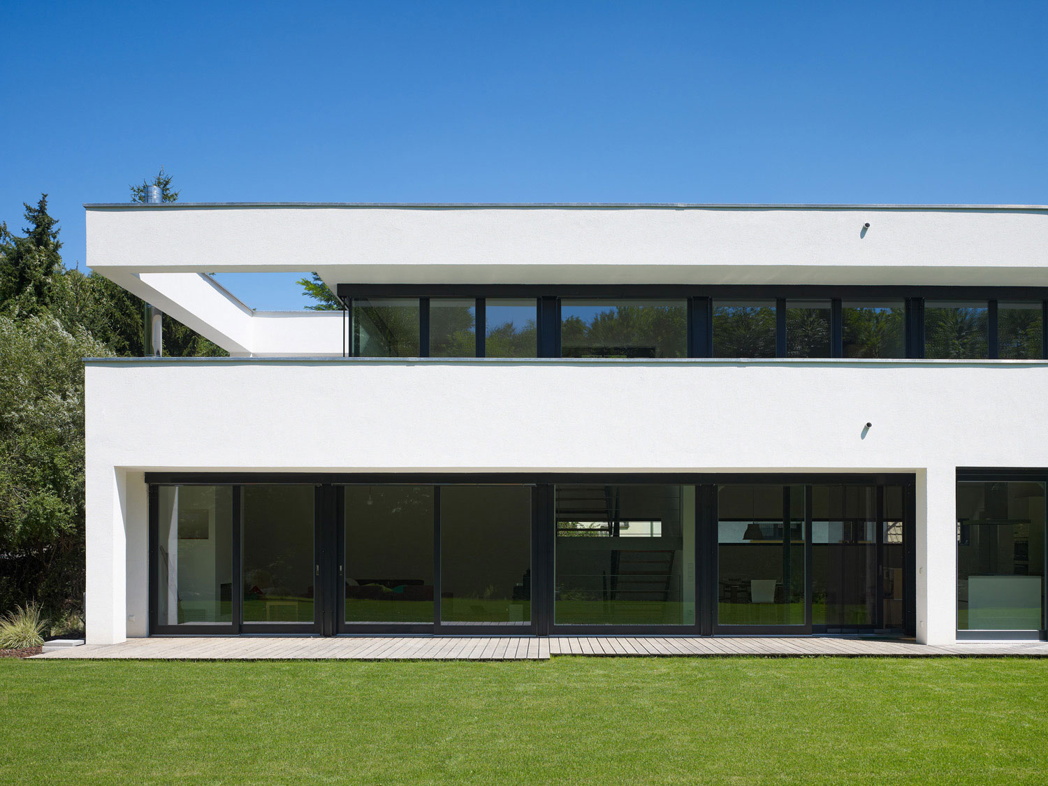 Durch den glücklichen Umstand des fehlenden Bebauungsplans war unsere Auflage gemäß § 34 Bau GB die Einbindung in die Umgebung. Entsprechend verfuhren wir mit der Anordnung des Baukörpers in Straßenflucht und der Geschossigkeit gemäß den Nachbarhäusern. Die moderne, klare Formensprache mit scharf geschnittenen Kanten fand Zustimmung bei Gemeinde und Bauverwaltung.