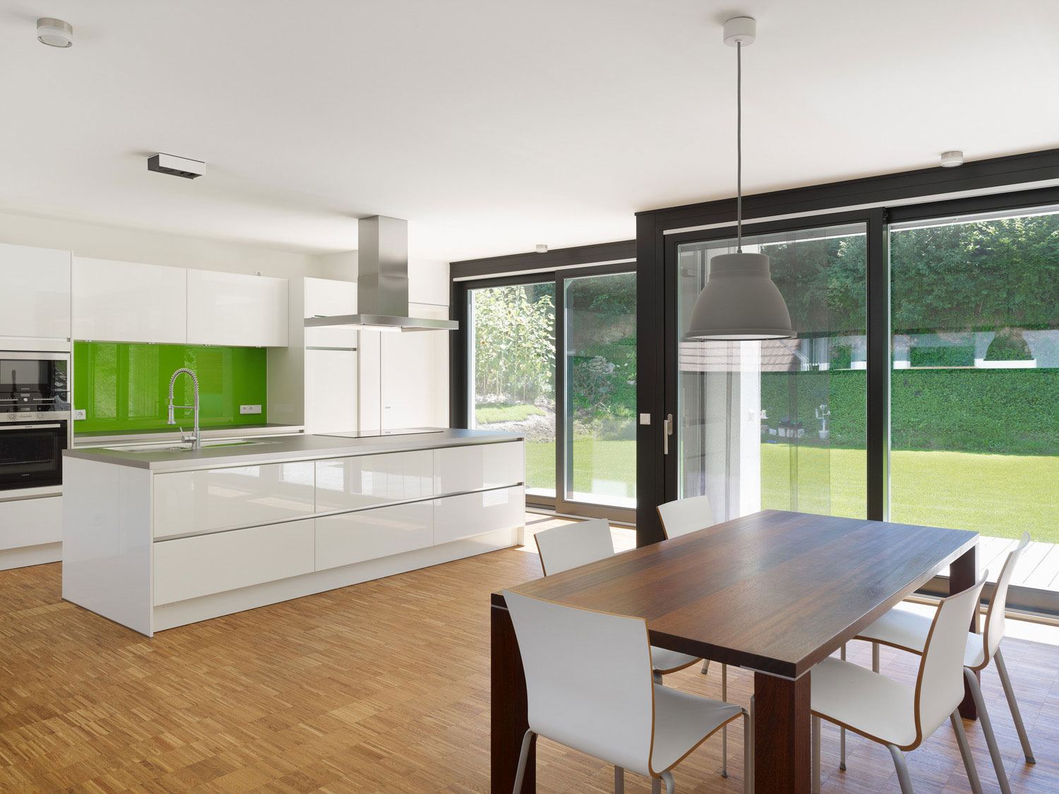 Das Gebäude ist ein Massivbau mit hoch gedämmter Fassade und Dach, die Fenster sind dreifach verglast. Mit der kontrollierten Wohnraumlüftung entstehen im Winter keine Energieverluste durch Fensterlüftung, bei gleich bleibender Luftqualität. Die Luft-Wasser-Wärmepumpe als Heizung ist effizient und deckt zudem den gesetzlich geforderten Einsatz regenerativer Energien problemlos ab. Die in allen Räumen verlegte Fußbodenheizung auf Massivparkett schafft die gewünschte Behaglichkeit, der offene Kamin sorgt für die dazugehörige Atmosphäre.