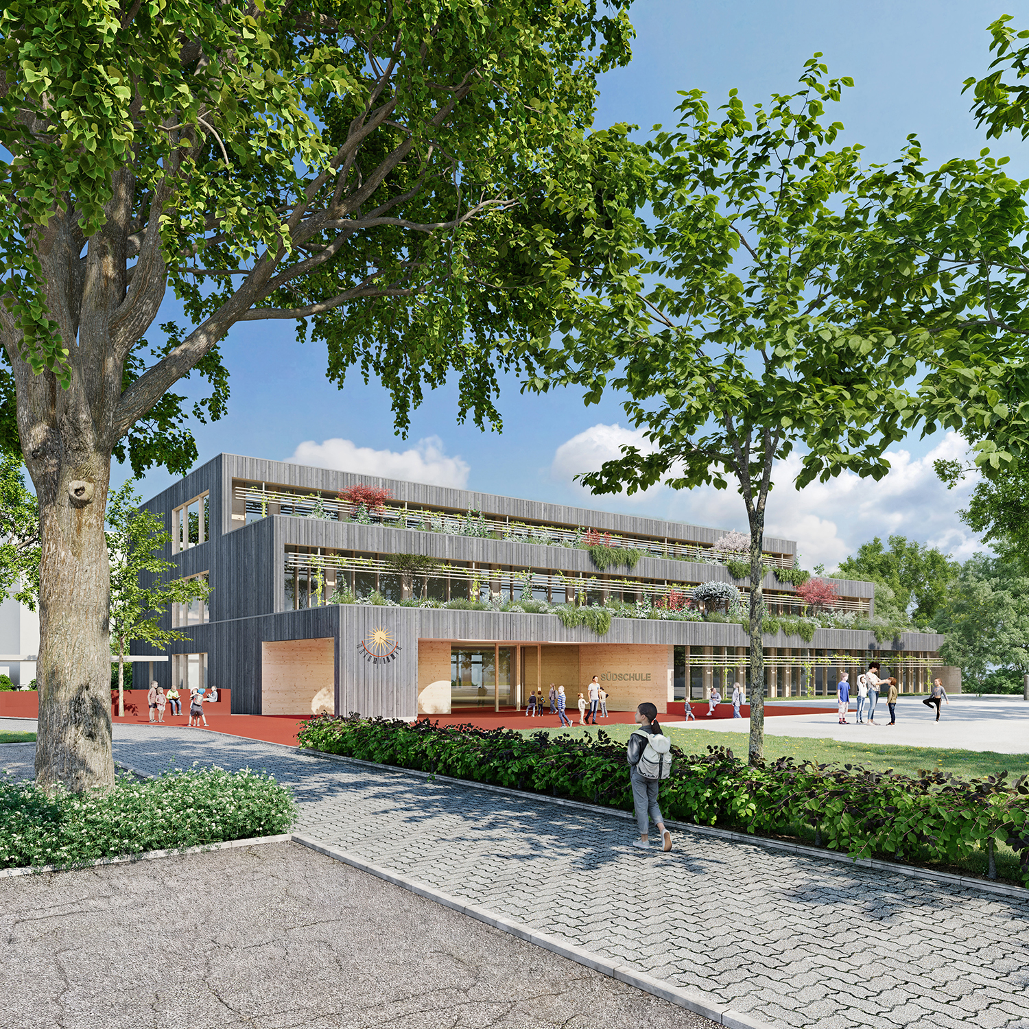 Nach Süd-Westen, Richtung Außenbereich der Schule, staffeln wir das Gebäude geschossweise bis zur Eingeschossigkeit ab und schaffen so eine angenehme Maßstäblichkeit für die jungen Schüler.