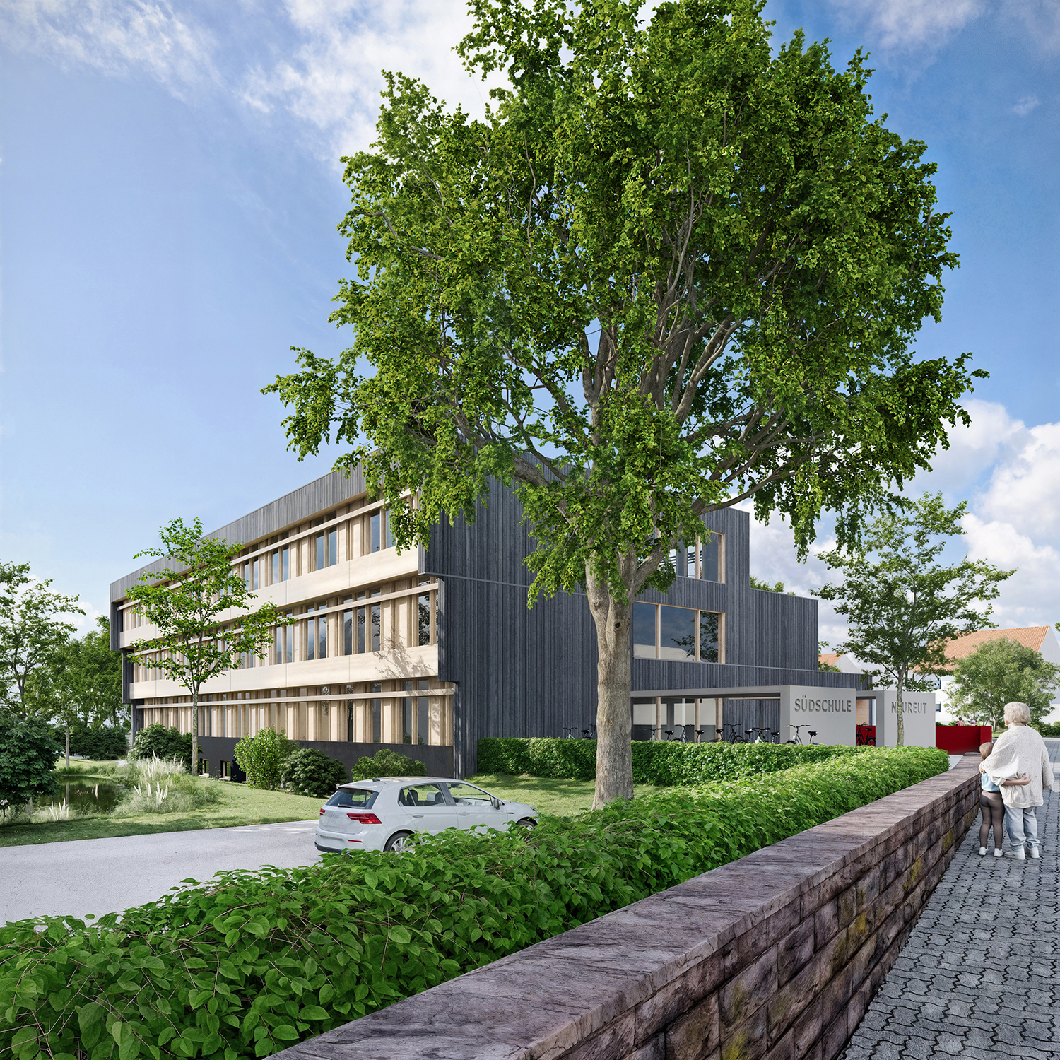 Das neue Schulgebäude wird als freistehender Baukörper im nördlichen Teil des Schulgeländes in das Areal eingebettet. Von der Welschneureuter Straße tritt das Schulhaus kaum in Erscheinung, da die Straße ca. 3 m tiefer liegt und durch das alte Schulhaus, welches erhalten bleibt und zukünftig fremdgenutzt wird, nahezu verdeckt wird. Von hier aus betrachtet steht der Neubau in zweiter Reihe an ähnlicher Stelle wie das abgängige Gebäude.