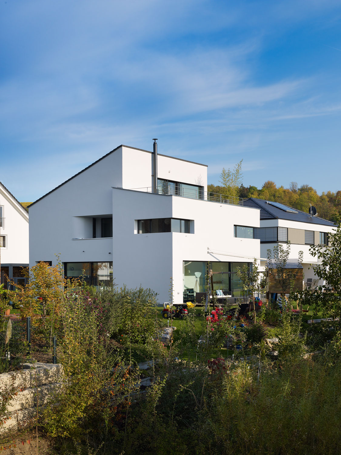 Das Haus O. liegt inmitten eines größeren, dicht bebauten Neubaugebietes. Der am Ende des Grundstücks vorbeiführende renaturierte Bachlauf schafft wohnenswerte Atmosphäre. Das Grundstück ist mit Süd-West Ausrichtung gut gelegen.