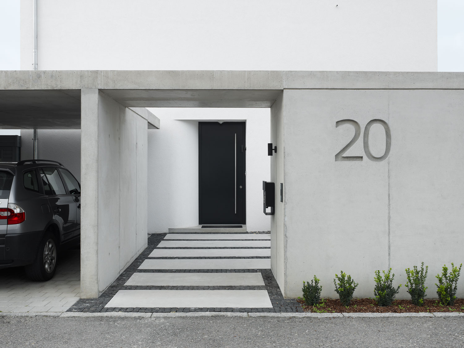 Der vor dem Haus stehende Sichtbeton-Carport und die Eingangssituation wurden in Entsprechung zur Dichte der Bebauung geplant. Das Haus selbst ist in zwei Baukörper gegliedert, so dass im Dachgeschoss durch den Gebäudeversatz eine großzügige Dachterrasse entsteht.