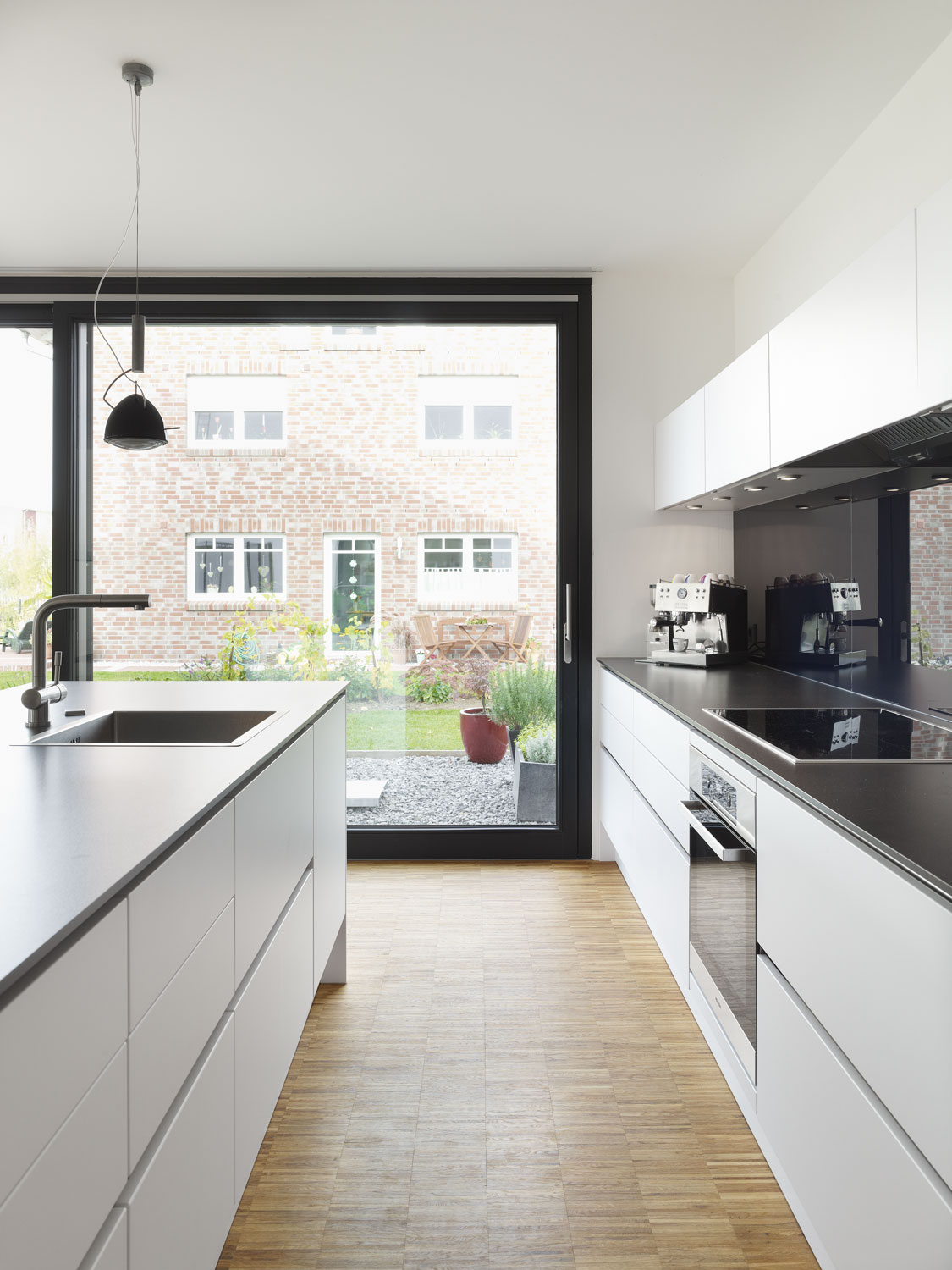 Die Wohnräume orientieren sich nach Süd-Westen Richtung Grünzug mit Bachlauf. Die Über-Eckverglasungen in den Kinderzimmern ermöglichen den Ausblick in zwei Richtungen und lassen am Morgen frühzeitig die Sonne in den Raum, der Lichteinfall hält am Nachmittag lange an.
