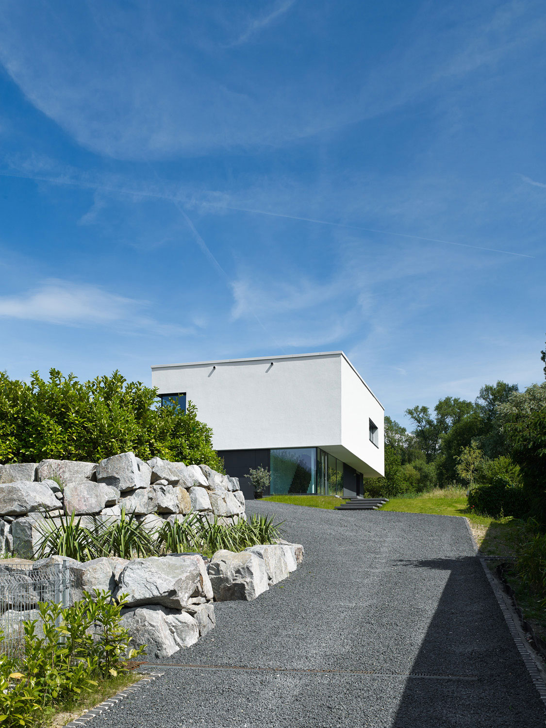 So passt sich der zweigeschossige Baukörper in seiner langgestreckten Kubatur dem Verlauf des Grundstücks an und die Kubatur wird durch ein geneigtes Flachdach in Richtung Südosten erhöht.