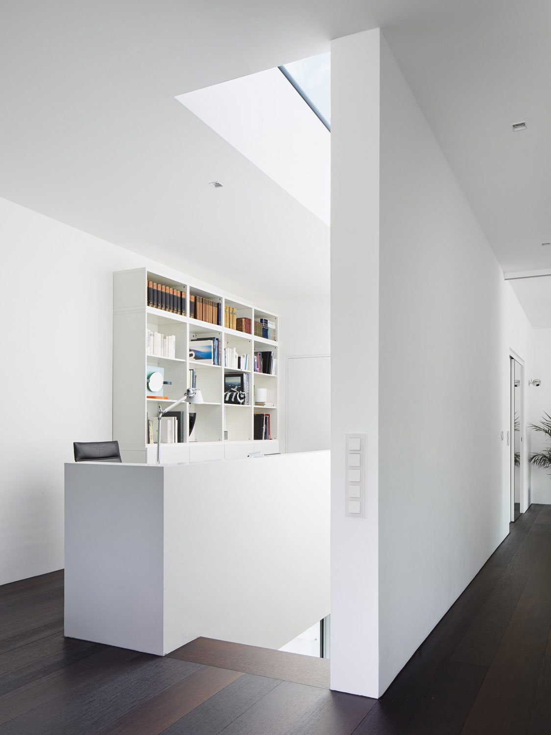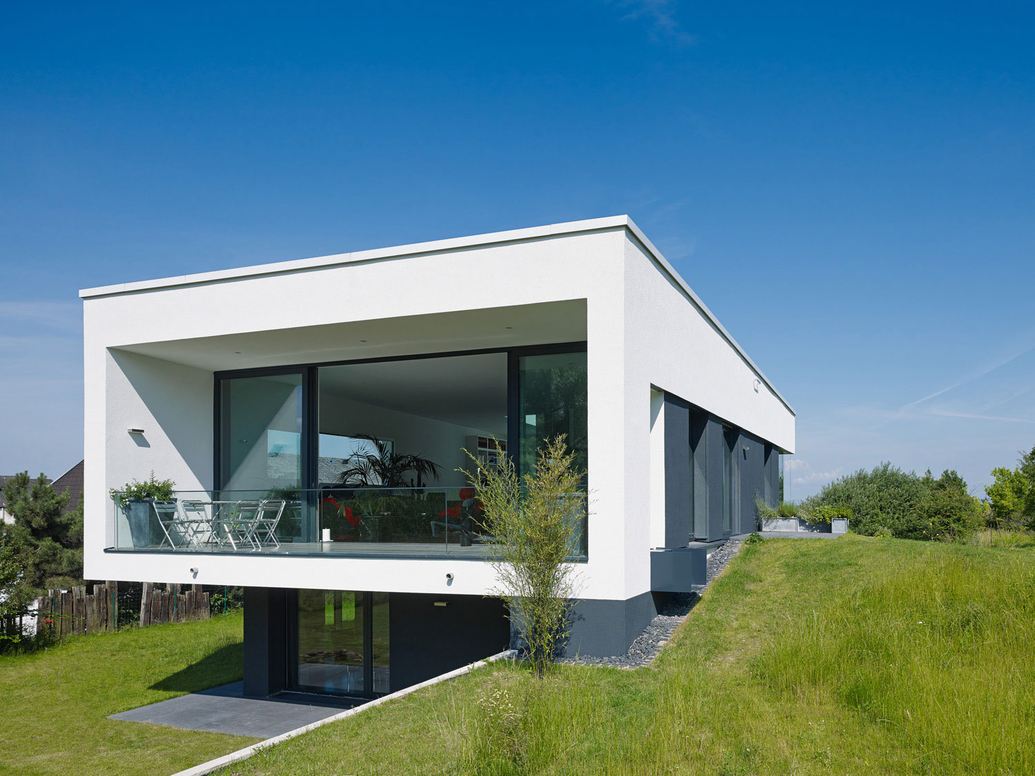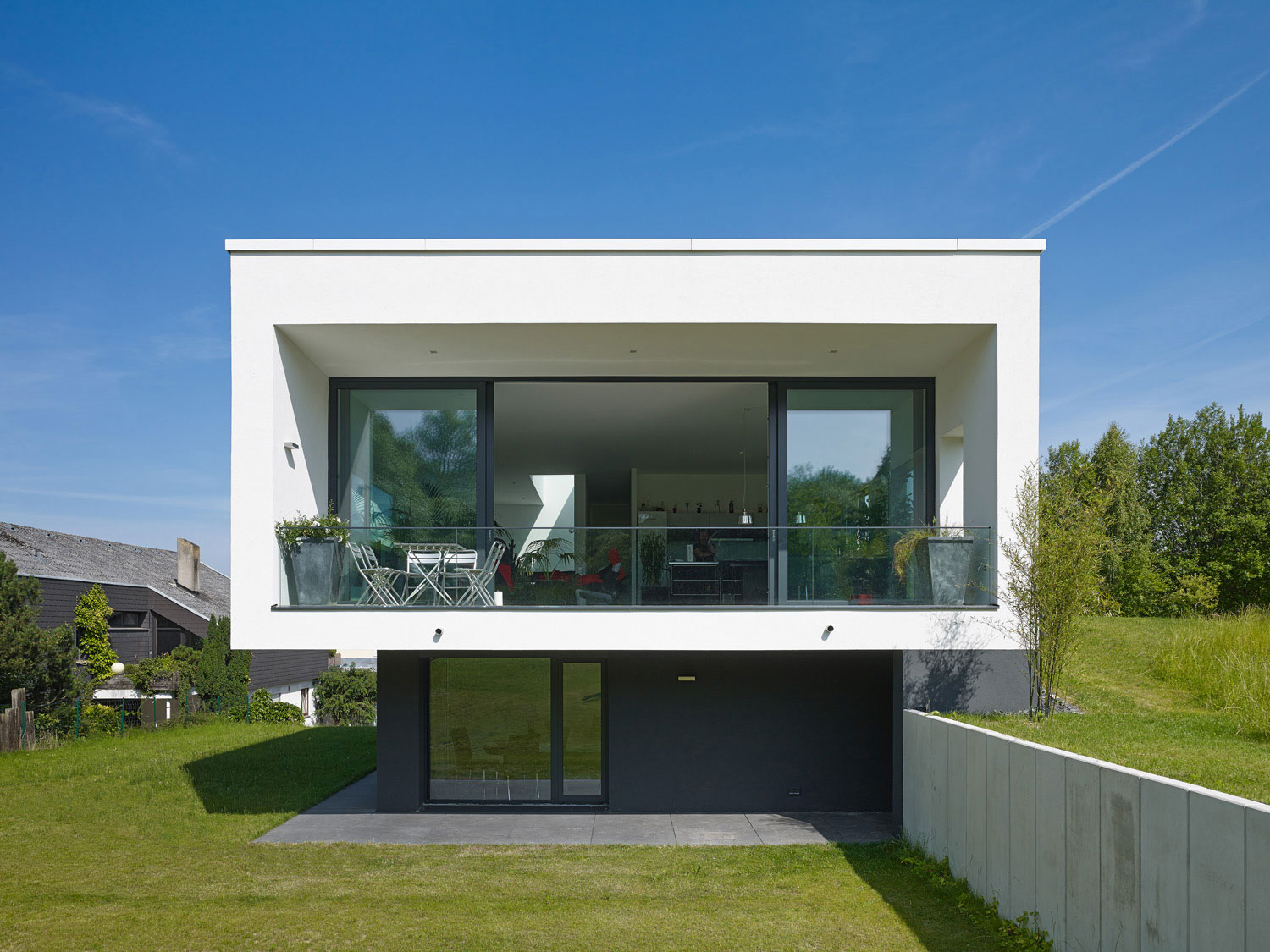 Betritt man das Gebäude durch den gläsernen Eingangsbereich, wird man sogleich über eine offene Treppe nach oben in den großen 3,30 m hohen Hauptraum des Wohnhauses geleitet, von wo aus sich dem Besucher der Blick durch eine raumhohe Glasfront hindurch nach außen eröffnet.