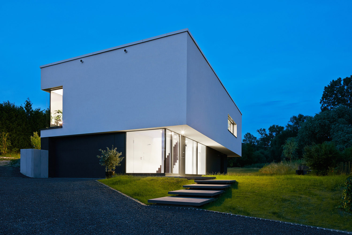 Von außen folgt die Gestaltung des Baukörpers dieser Zweiteilung der Funktionen: das Erdgeschoss, in dem sich die Nebenräume befinden, ist farblich komplett in Anthrazitgrau abgesetzt und der Baukörper gegenüber dem Obergeschoss, in dem sich die Haupträume befinden, eingerückt.