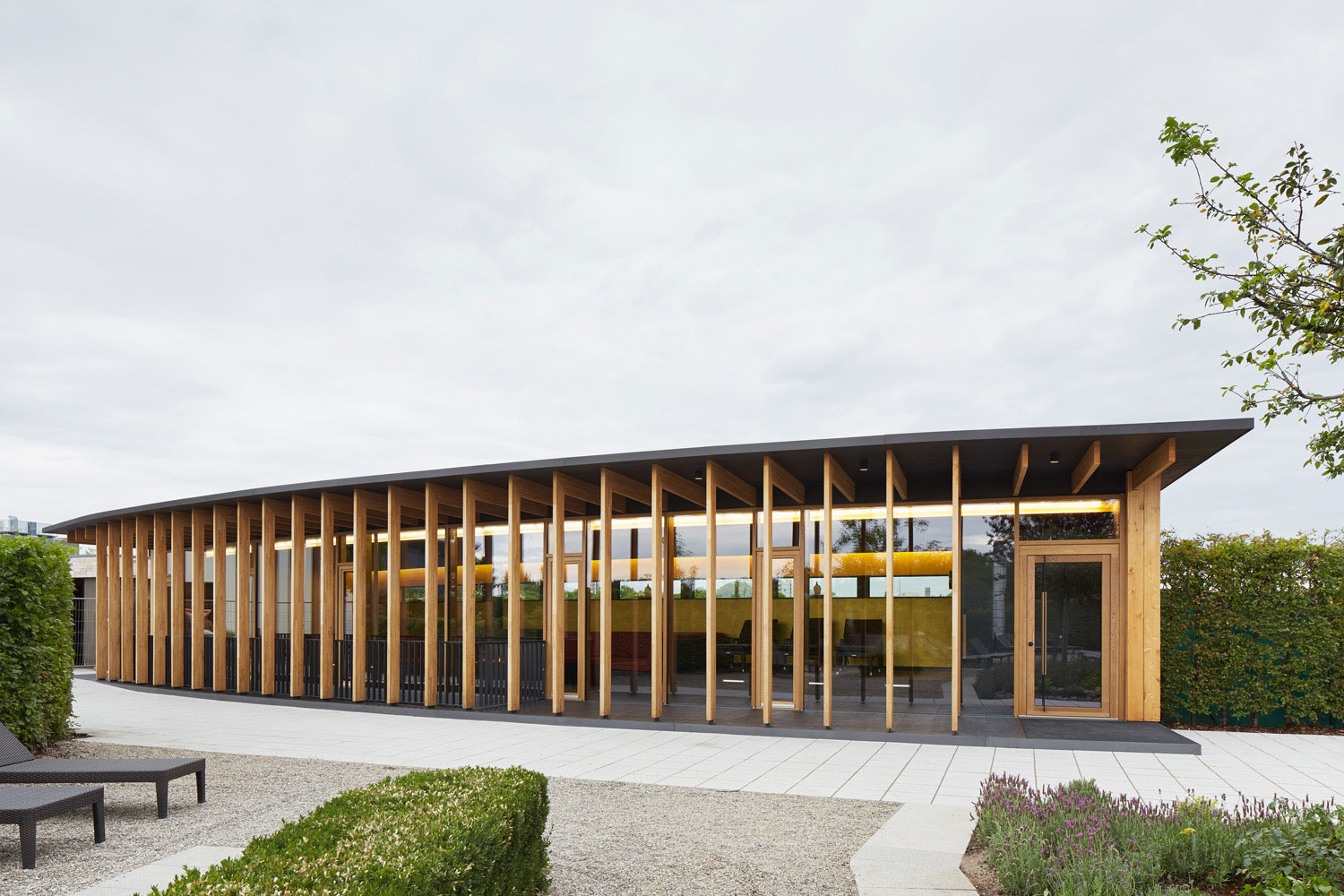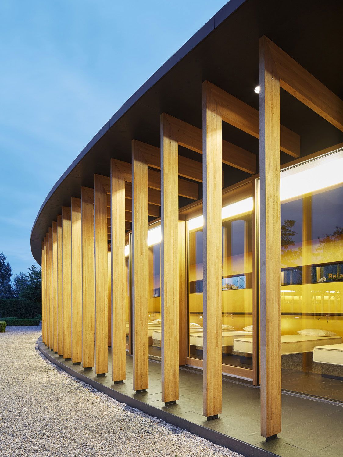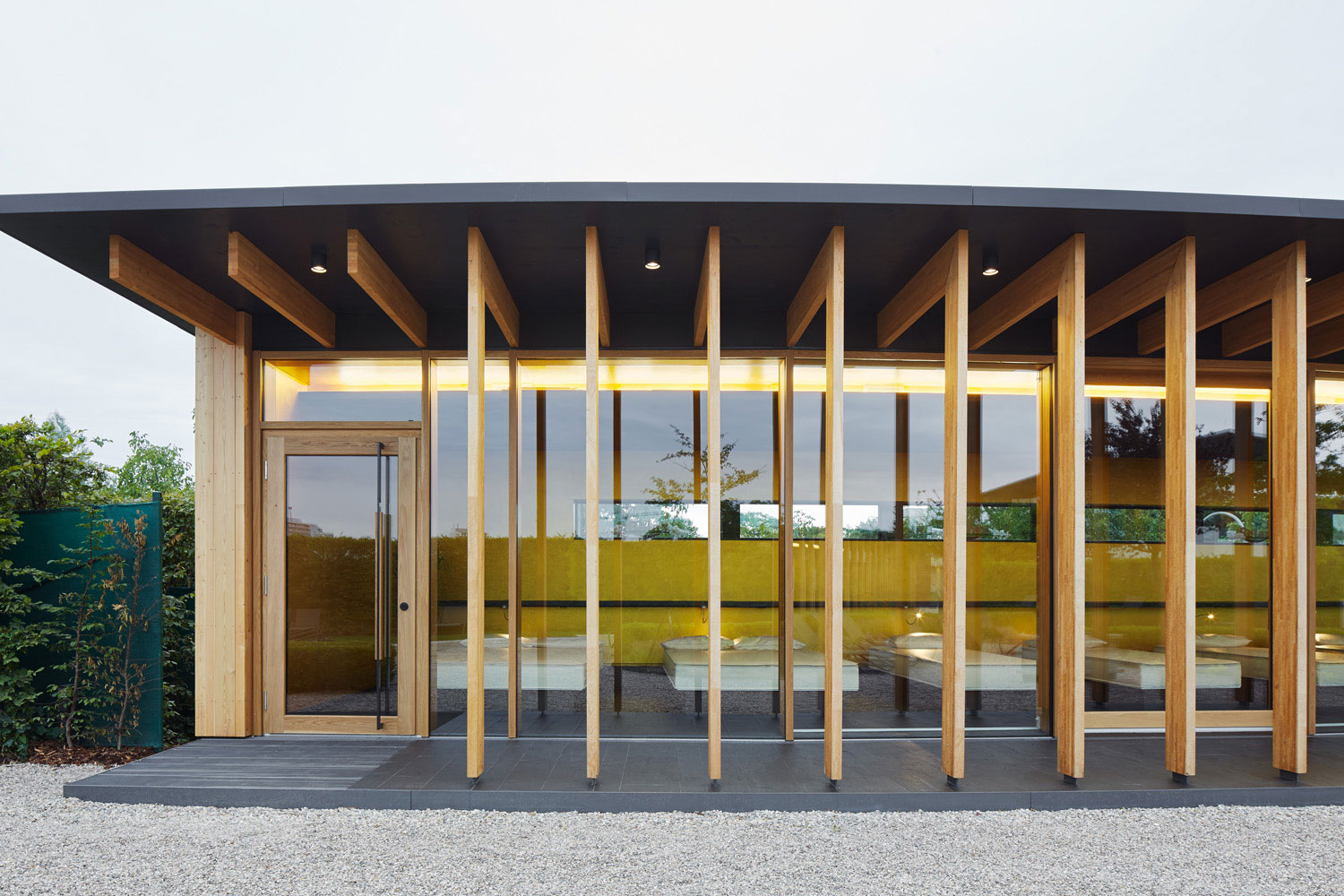 Dass ein Gebäude innerhalb einer Saunalandschaft als Holzbau konstruiert wird, stand für uns nicht in Frage. Es entstand ein Holzrahmenbau, der sich zum Garten hin skeletthaft auflöst. Durch die Krümmung der Gebäude und den vorgelagerten Arkadengang entsteht ein Zwischenraum, der nicht nur Sonne, sondern auch Blicke filtert. Trotz der Vollverglasung zum Garten fühlt man sich geborgen.