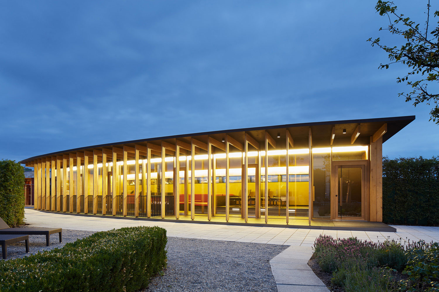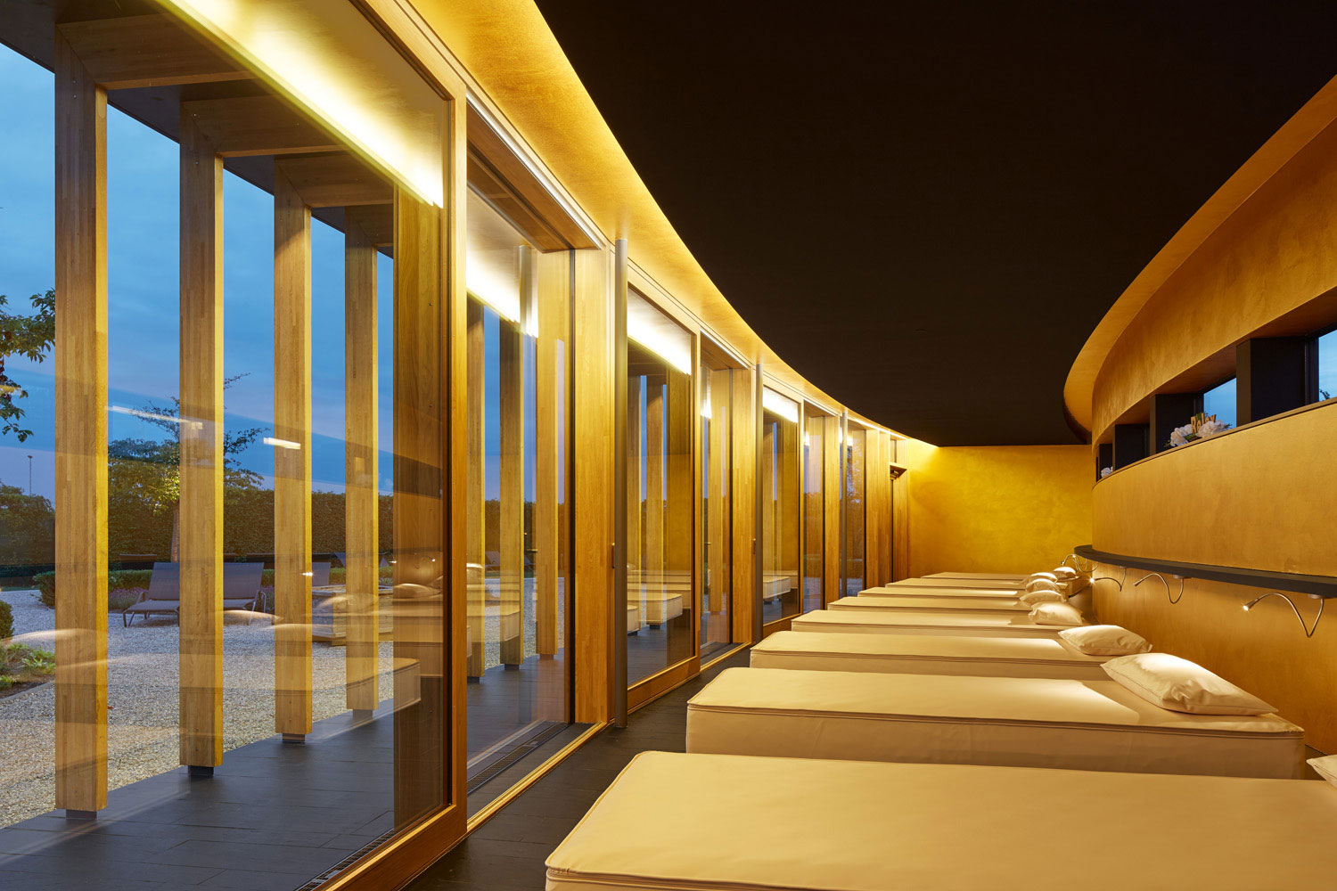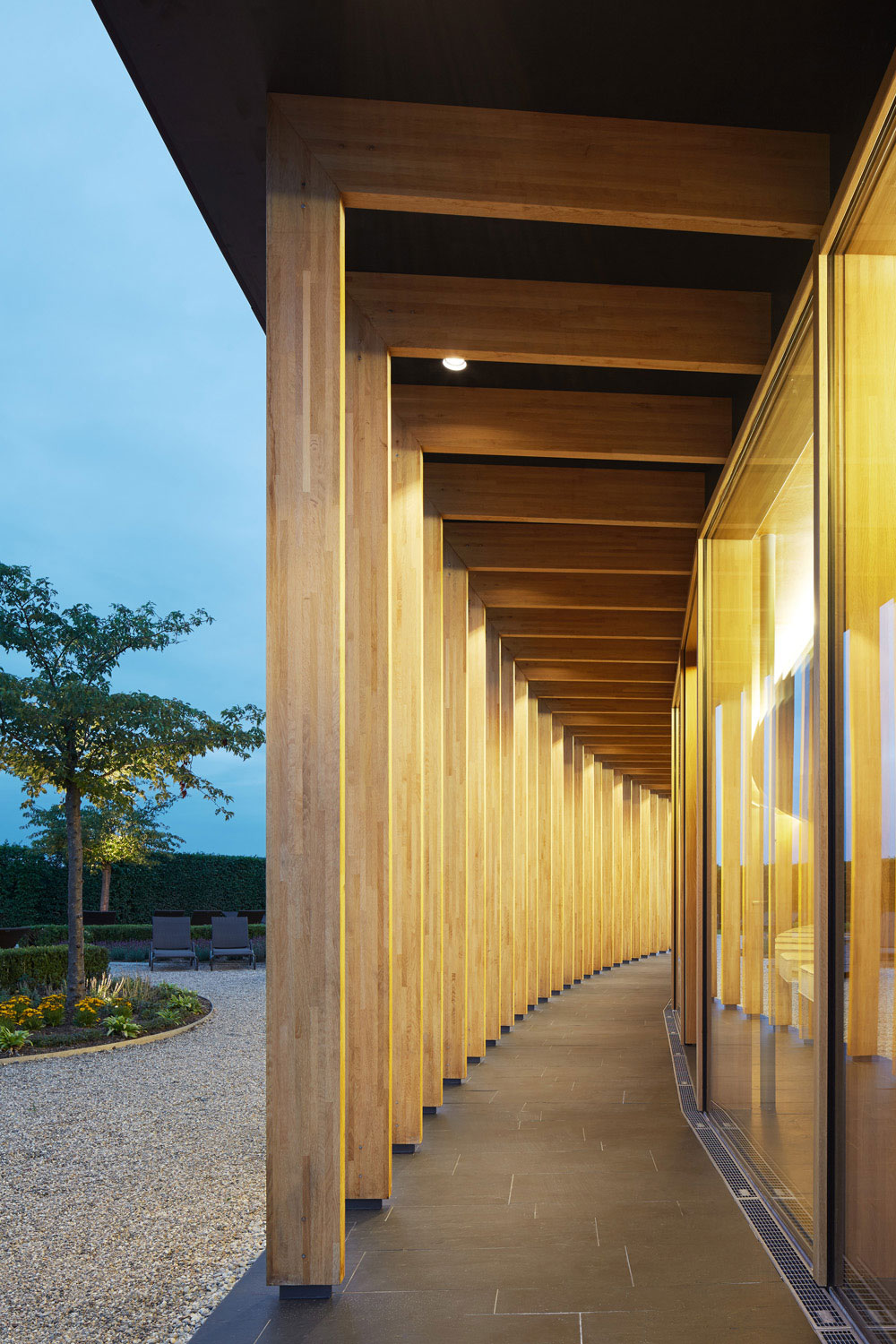Dass ein Gebäude innerhalb einer Saunalandschaft als Holzbau konstruiert wird, stand für uns nicht in Frage. Es entstand ein Holzrahmenbau, der sich zum Garten hin skeletthaft auflöst. Durch die Krümmung der Gebäude und den vorgelagerten Arkadengang entsteht ein Zwischenraum, der nicht nur Sonne, sondern auch Blicke filtert. Trotz der Vollverglasung zum Garten fühlt man sich geborgen.