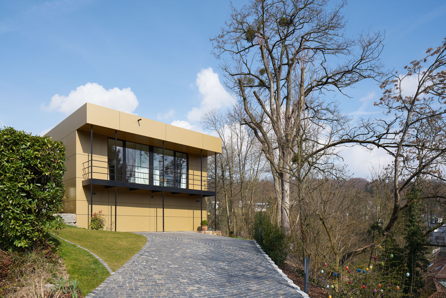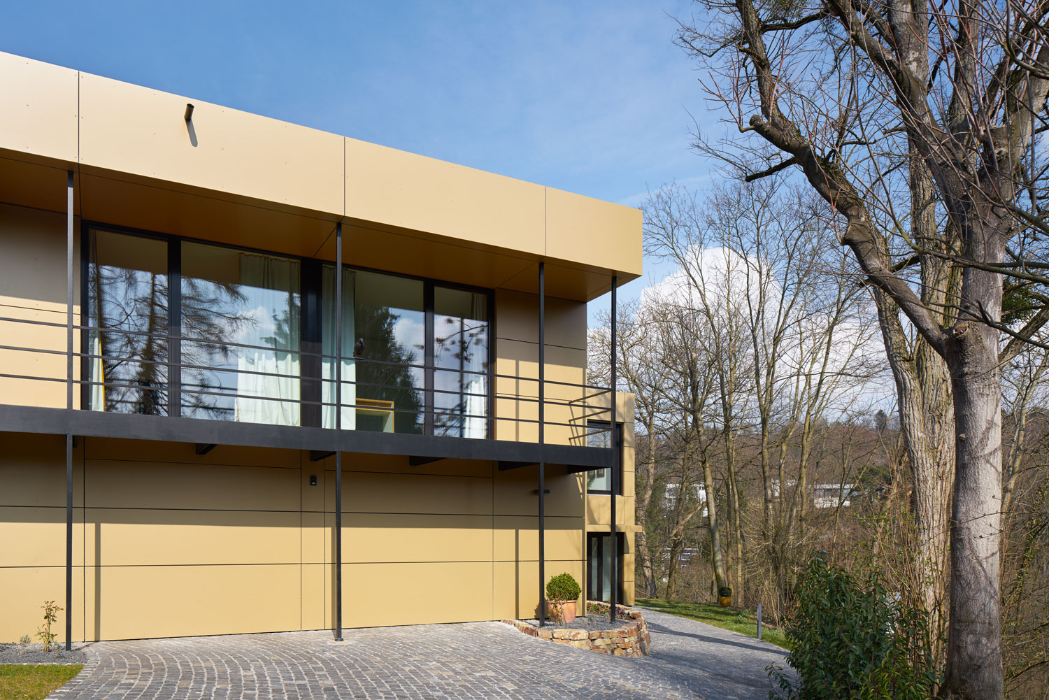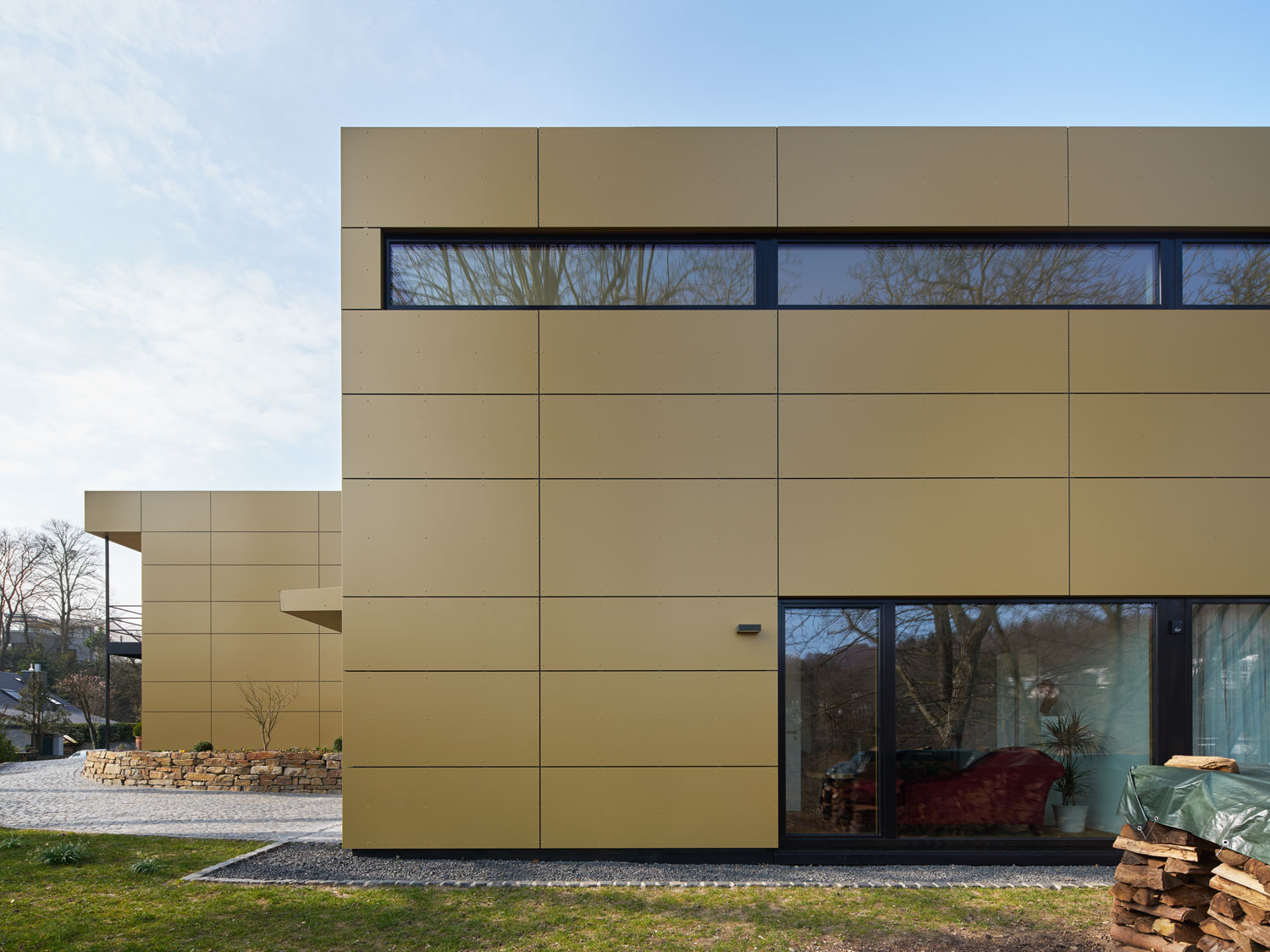 Durch den Einsatz einer vorgehängten, hinterlüfteten Metallfassade mit Mineralwolldämmung konnte diesem Anspruch Rechnung getragen werden. Die flexible Anordnung der eingesetzten goldenen Alucobond-Platten verleiht dem Gebäude eine neue Leichtigkeit und ermöglicht eine zeitgemäße Interpretation der ursprünglichen Haltung des Gebäudes.