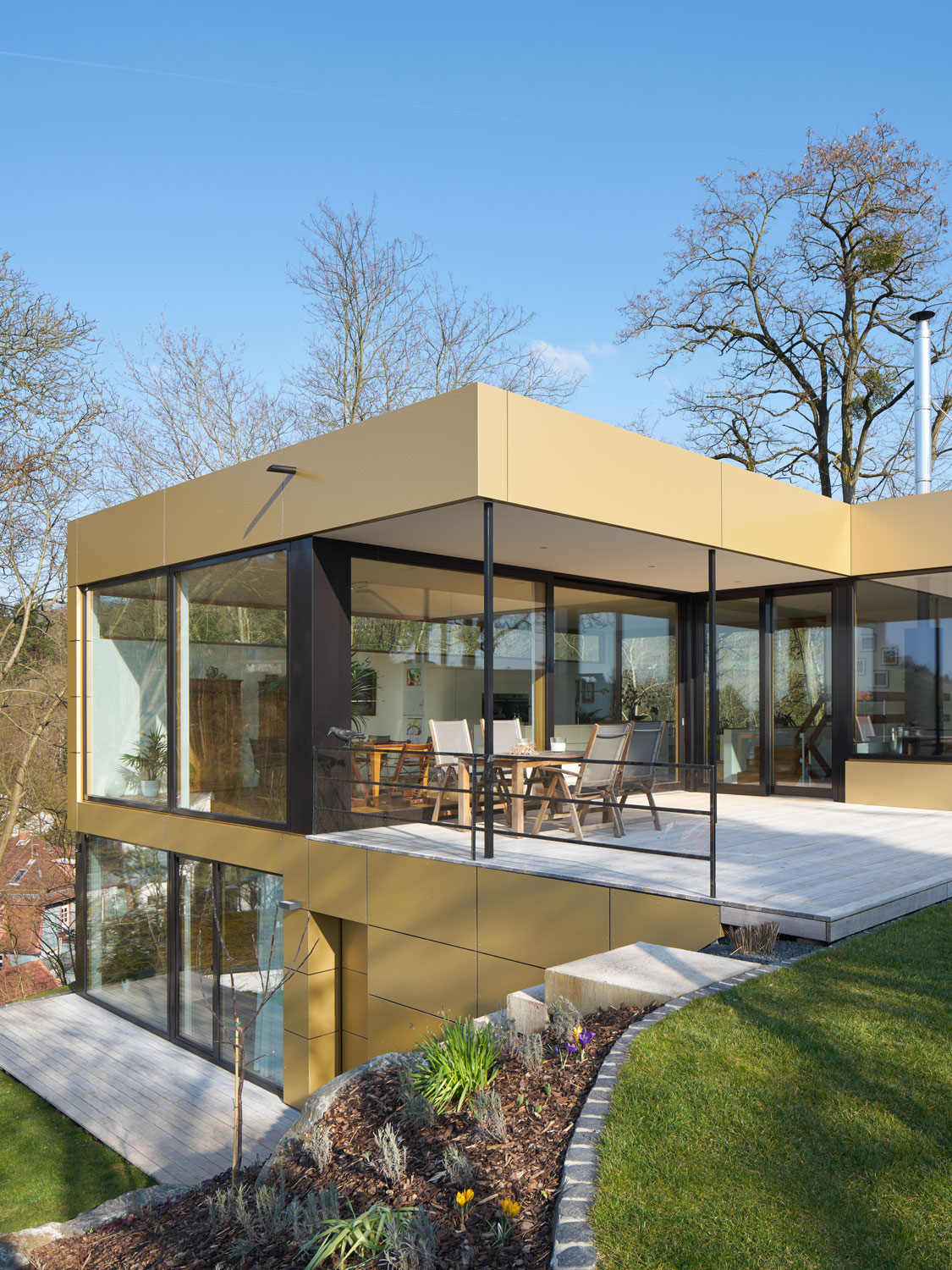 Im Zusammenspiel mit der goldenen Alucobond-Fassade wurden Holz-Aluminium-Fenster mit schwarzer Aluschale eingebaut. Nach innen wurden die Fenster holzfarben belassen - passend zum neuen Parkettboden sowie den erhaltenen Treppengeländern. Großzügige Hebe-Schiebe-Elemente bilden den Zugang zu den Terrassen und ermöglichen den fließenden Übergang von innen nach außen. Auf eine Verschattung von außen wurde verzichtet.