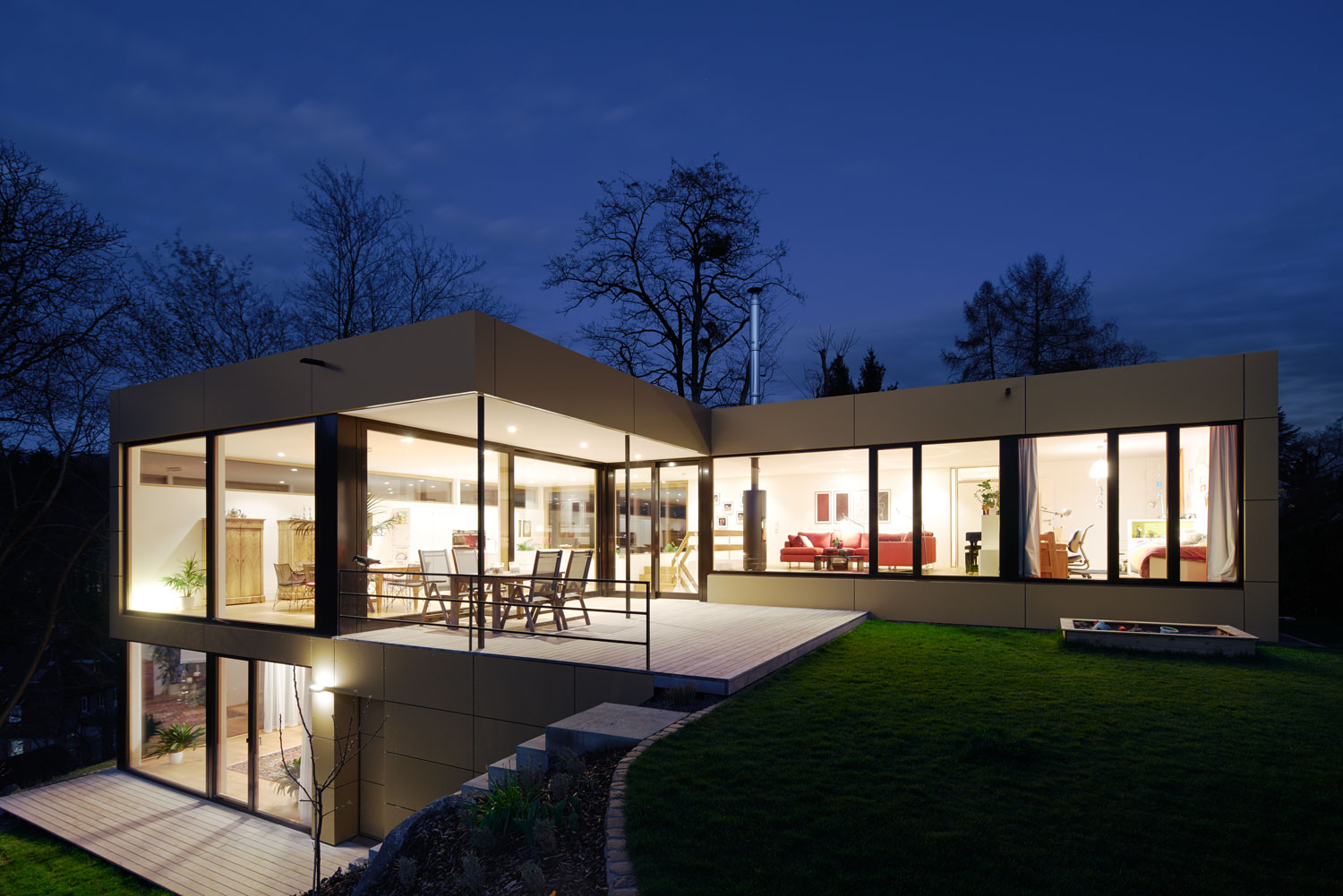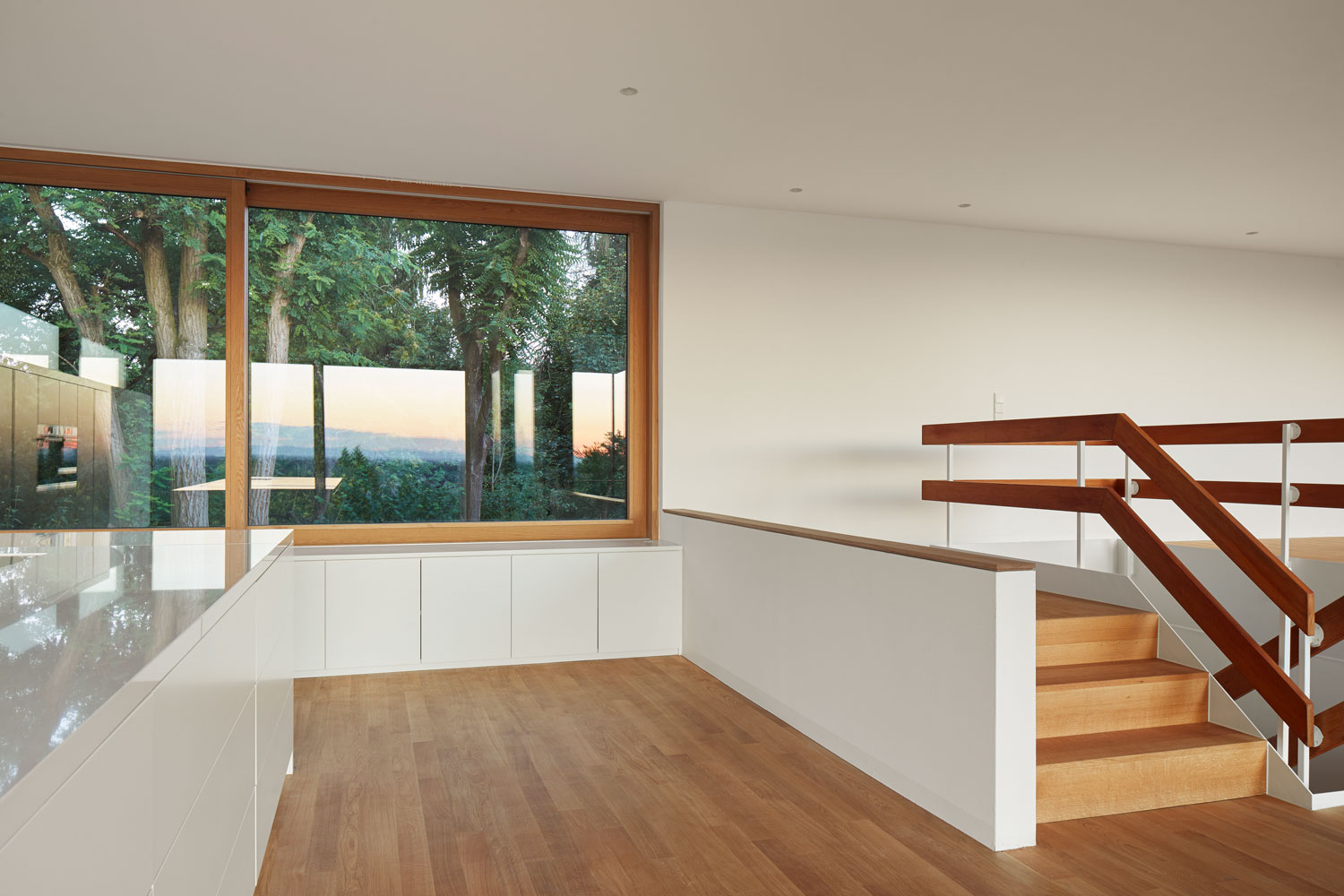 Beide Geschosse funktionieren als Split-Level, was im Obergeschoss in Verbindung mit dem durchlaufenden Flachdach einen offenen, überhöhten Koch- und Essbereich ermöglicht. Von hier schließt die neue, großzügige und in Teilen überdachte Holzterrasse mit Westausrichtung an. Dem Betrachter eröffnet sich eine einzigartige Aussicht zum nahegelegenen Turmberg sowie in das Tal als Blick über ganz Karlsruhe.