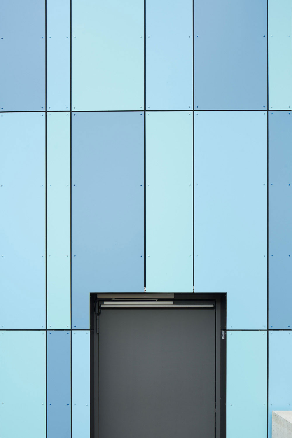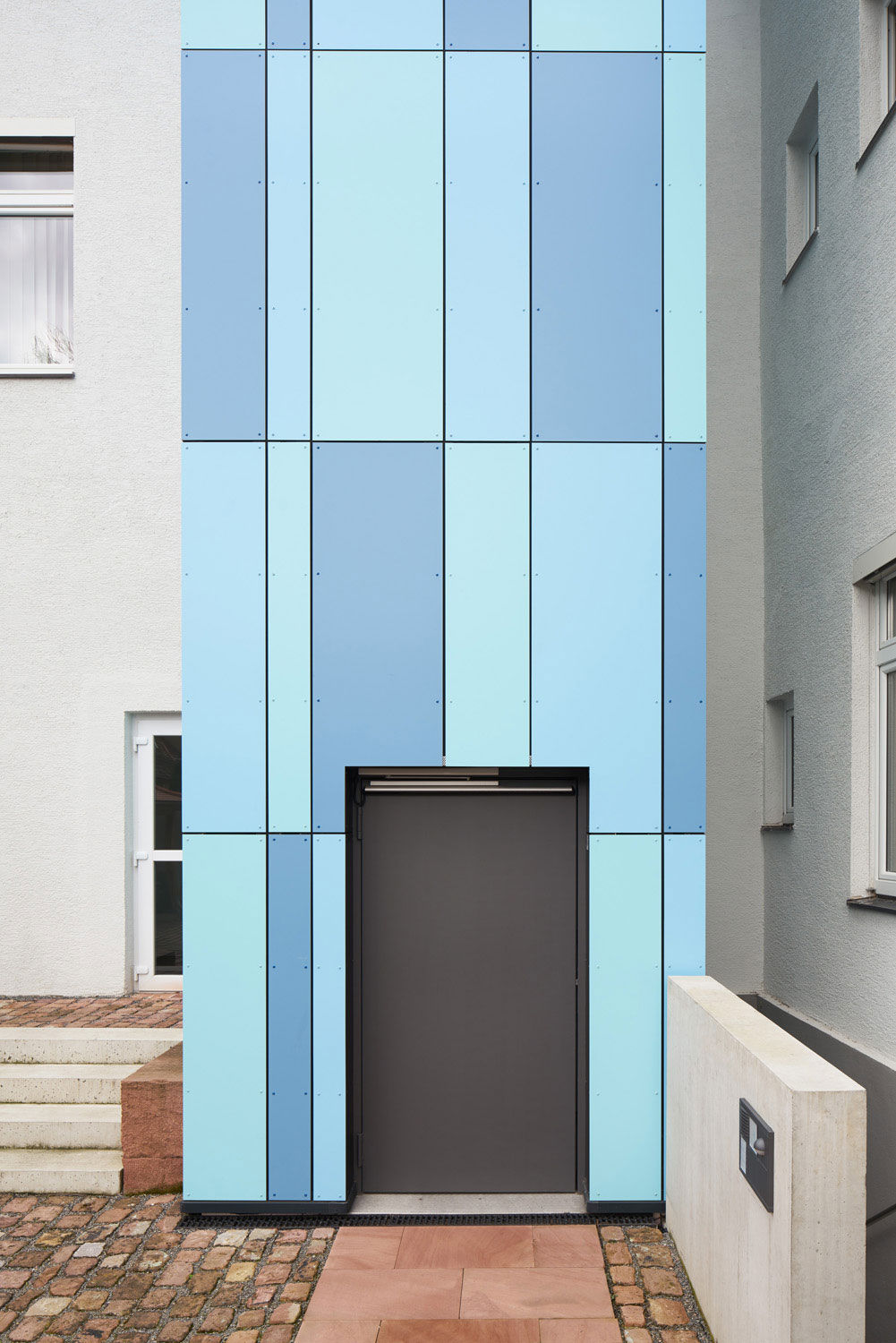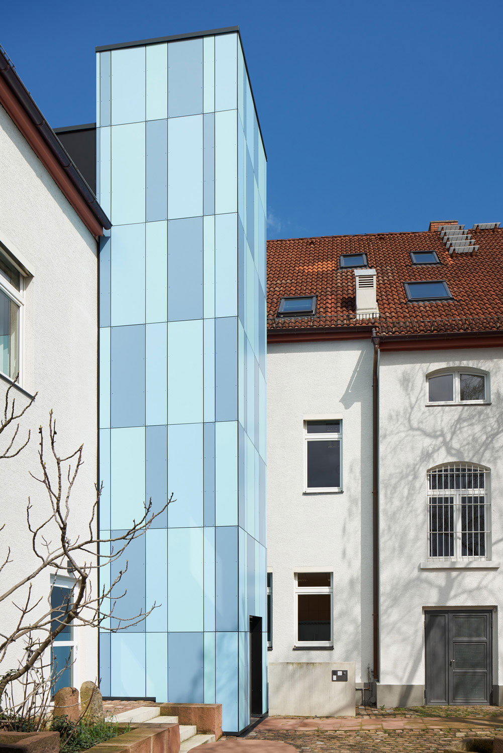 Es entstand ein frei vor der Fassade stehender Aufzugsturm, der alle Geschosse bedienen kann. Der Aufzug wurde gemäß der Firmenfarbe blau gestaltet, jedoch als Patchwork, mit unterschiedlichen Plattenformaten und dreierlei Blautönen.