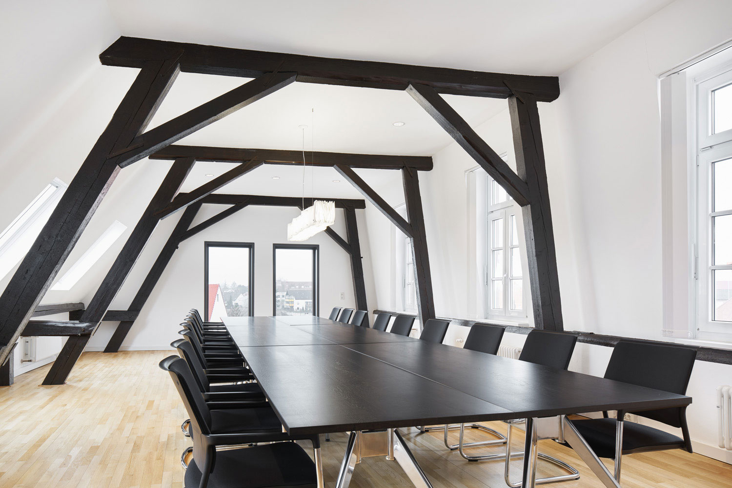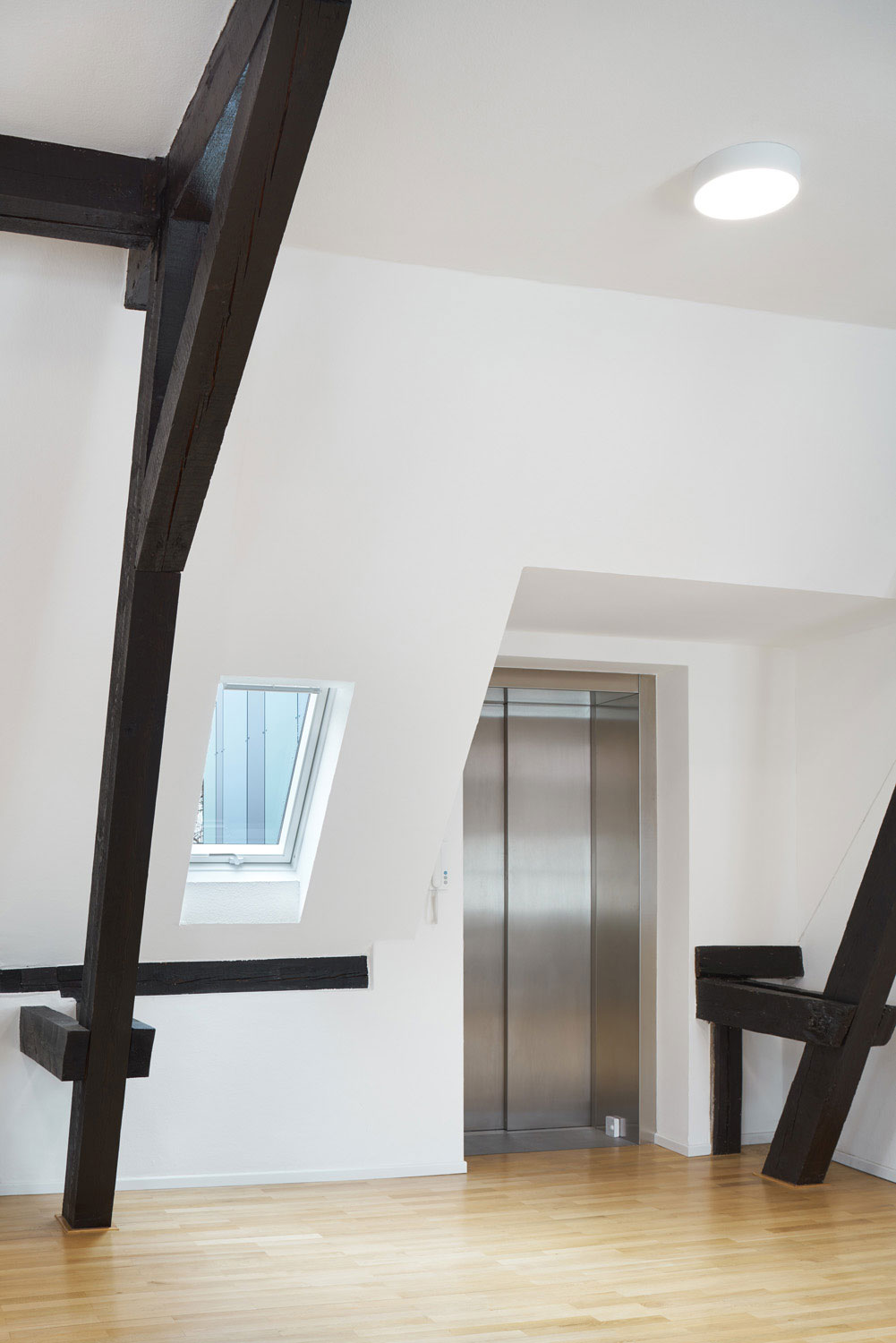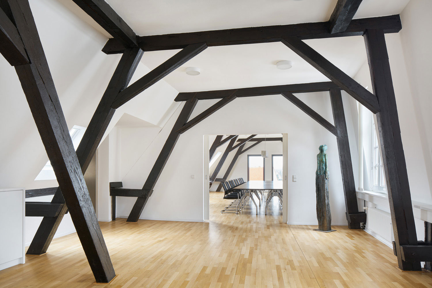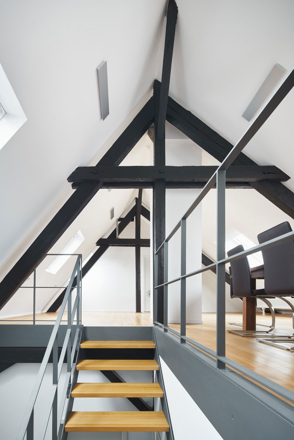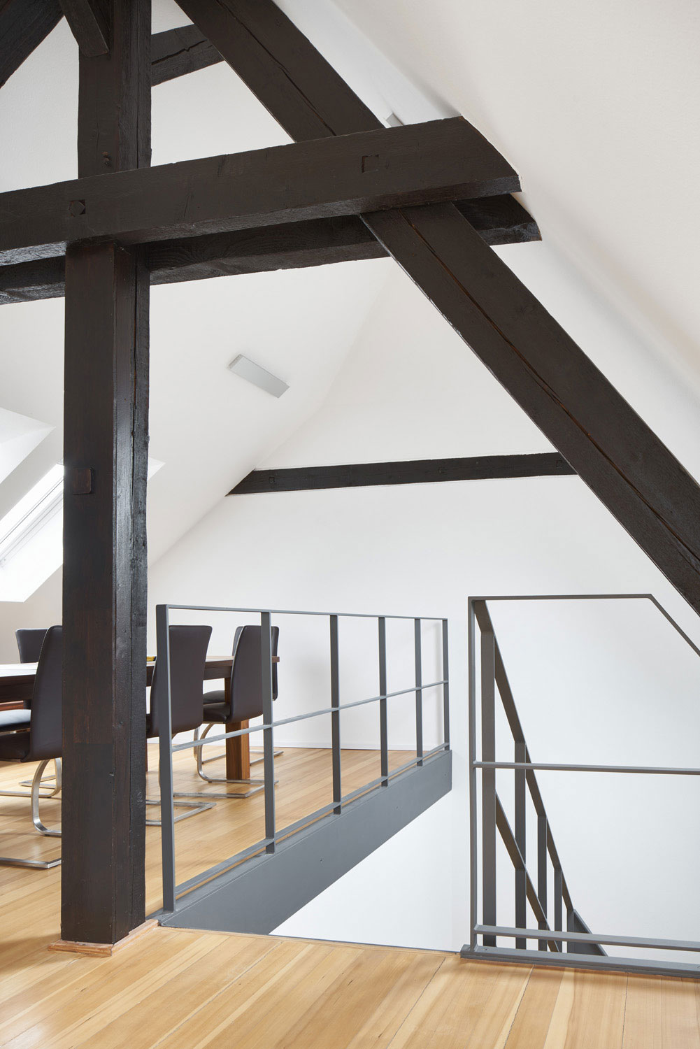 Das Dachgeschoss wurde „entrümpelt", das Holzdach-Tragwerk freigelegt und der Grundriss neu gestaltet. Ziel war es, das Dachtragwerk nicht wieder komplett in den Ausbauwänden verschwinden zu lassen, sondern ablesbar in die Innenraumgestaltung zu integrieren.