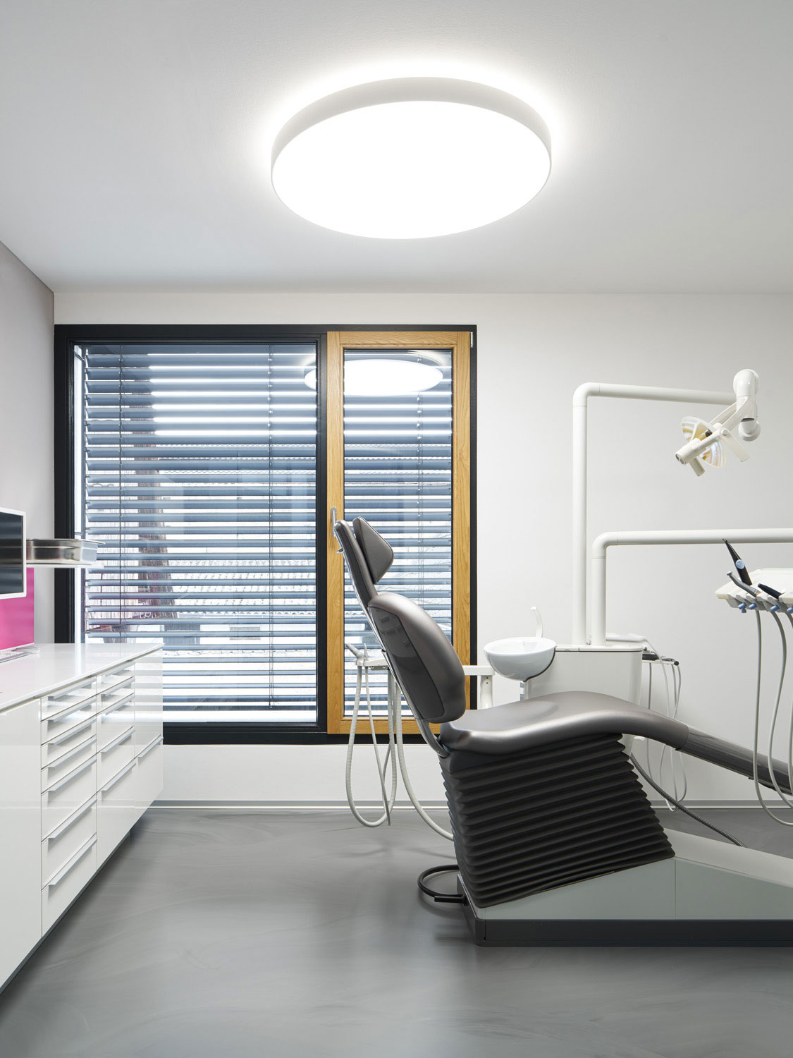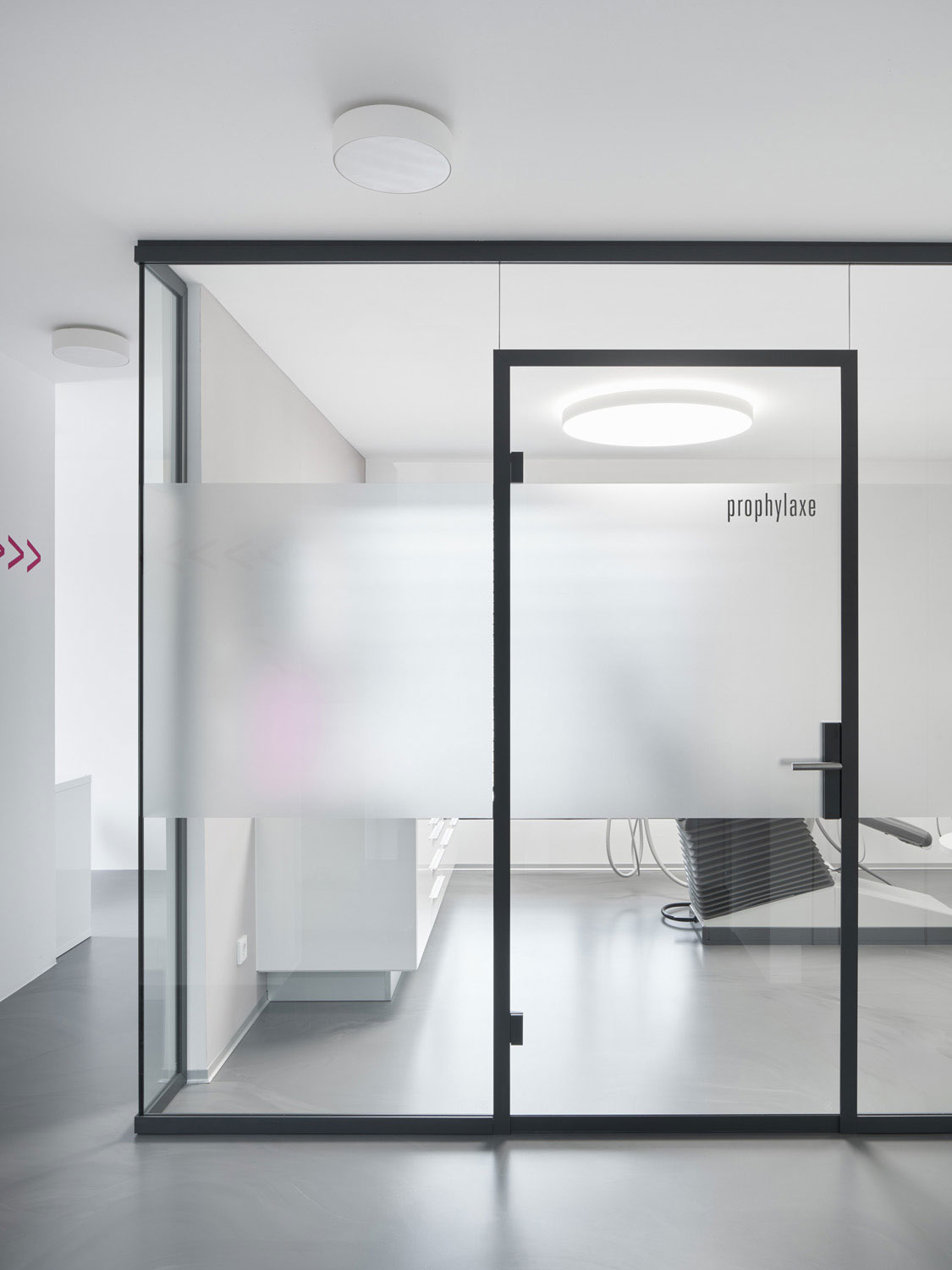 Das giebelständige Vorderhaus mit gereihten, stehenden Fensterformaten steht selbstbewusst zum Straßenraum. Die Volumensubtraktion am Gebäudeeck markiert den Eingang zur hochmodernen Praxis, die sich über alle Geschosse ausdehnt. Über den bestechend einfachen Treppenraum betritt man die Behandlungsräume. Diese wirken transparent, hell und dort durchlässig, wo es die Privatsphäre der Patienten nicht stört.