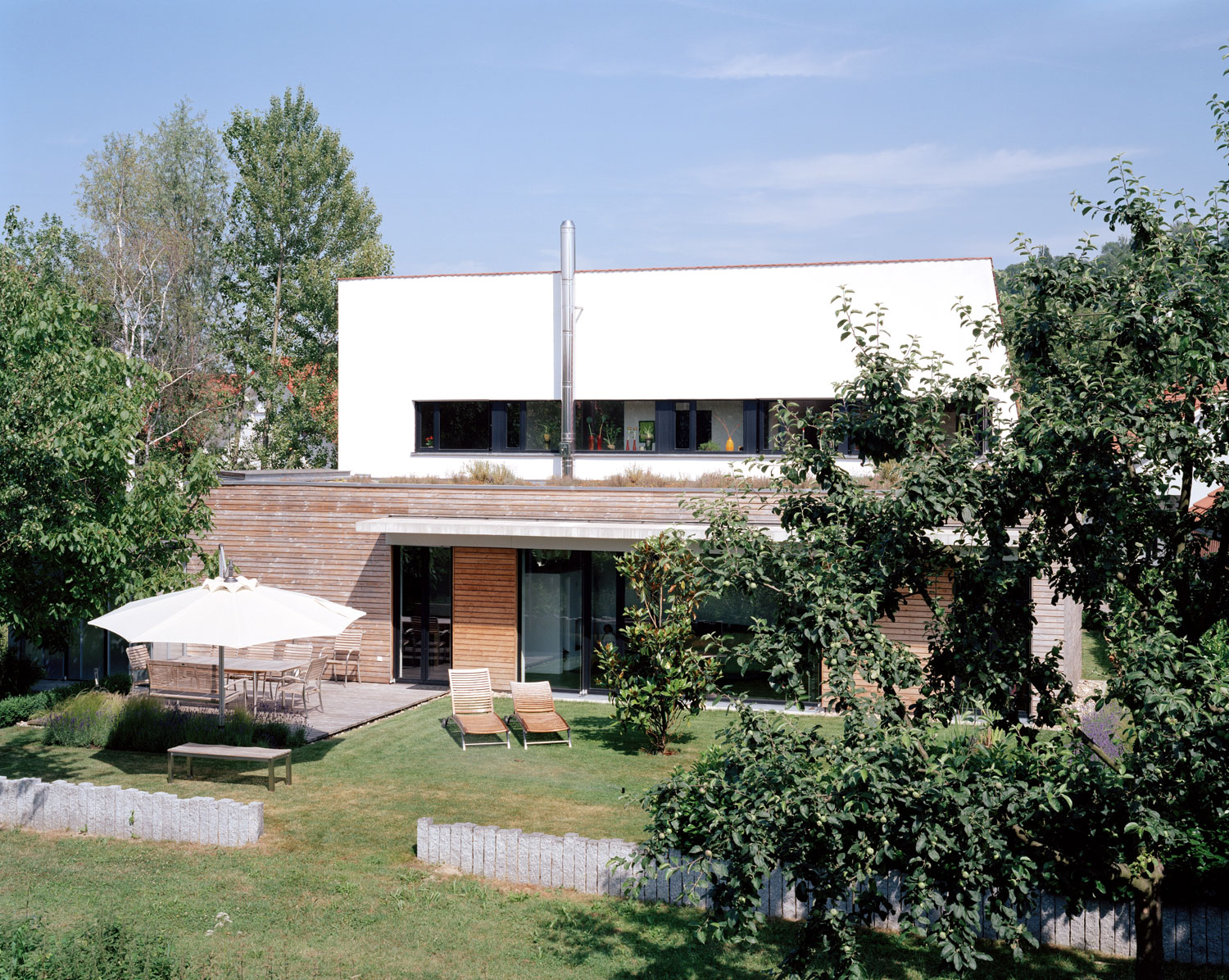 Auf der Gartenseite schließt der eingeschossige Holzbau mit begrüntem Flachdach an. Hier befinden sich die „öffentlichen“ Bereiche: Wohnen und Essen.
