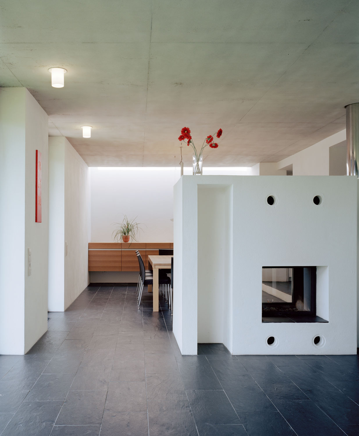 Der Essplatz ist als ruhiger zentraler Ort konzipiert. Der Raum besitzt keine Fenster, öffnet sich jedoch zum lichtdurchfluteten Wohnraum. Nur das Oberlicht wirft ein fast mystisches Streiflicht über die verputzte, weiße Innenwand.