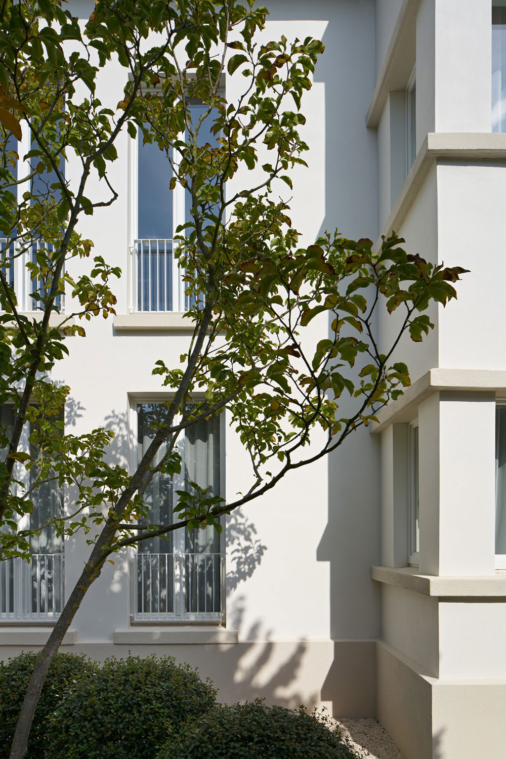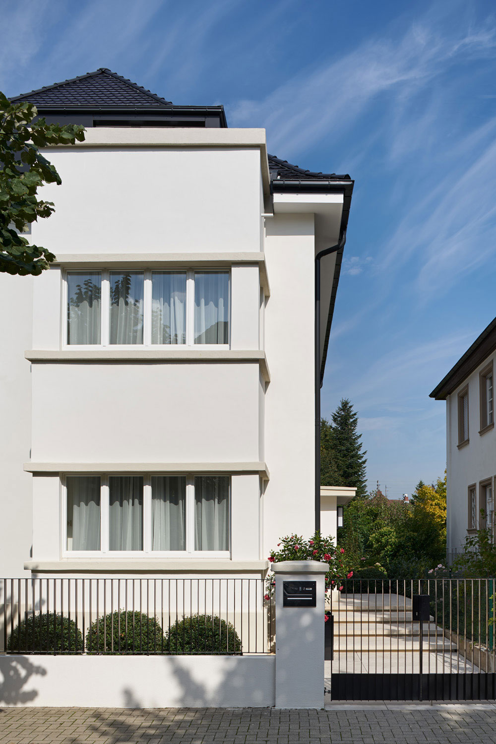 An Fassade und Dach wurden in erster Linie die unpassenden Renovierungs-, Umbau und Instandhaltungsarbeiten der letzten Jahrzehnte in den ursprünglichen Zustand zurückgeführt und erneuert. Als kleinere substanzielle Eingriffe waren nur die bodentiefen Fenster zur Straße und eine neue Balkonanlage auf Gartenseite notwendig. Insgesamt bestand der Wunsch, die klassischen Elemente der späten 20er Jahre und des ArtDeco wieder spürbar zu machen und mit modernen und zeitgemäßen Details zusammenzubringen. Dies vom Gartenzaun und Tor, dem Hauszugang, der barocken Gartenanlage mit integriertem Koi-Teich bis hin zur durchgängigen Innenraumgestaltung in gleicher, hoher Qualität.