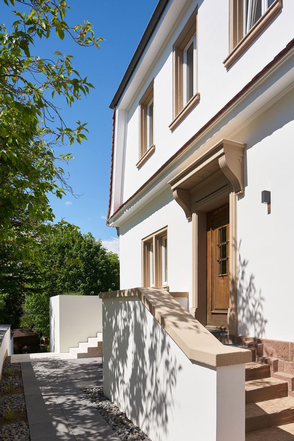 Auf der Straßenseite wurde die alles zusammenfassende Gartenwand restauriert und durch eine angemessene, aber unaufgeregte Eingangssituation zum Abschluss gebracht.