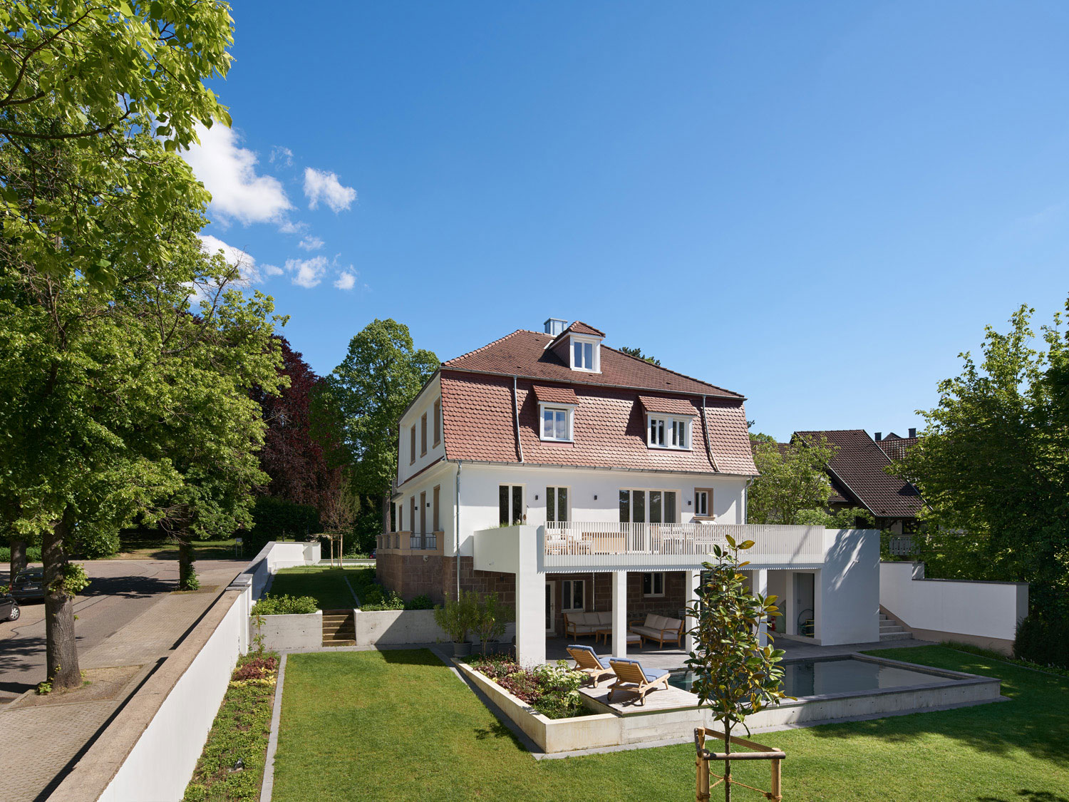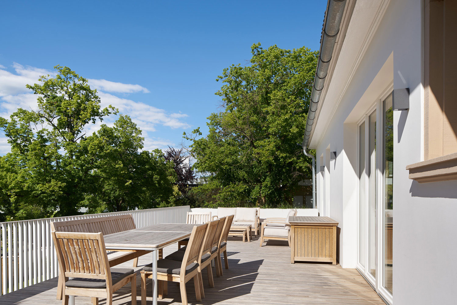 Die größten Eingriffe fanden in den Außenanlagen statt. So wurde eine Terrassenkonstruktion auf der talseitigen Gartenseite realisiert, die dem im Erdgeschoss liegenden Koch-Essbereich vorgelagert wurde. Der darunter liegende, überdachte Außenbereich dient als sonnengeschützte Terrasse auf Pool- also Gartenebene.