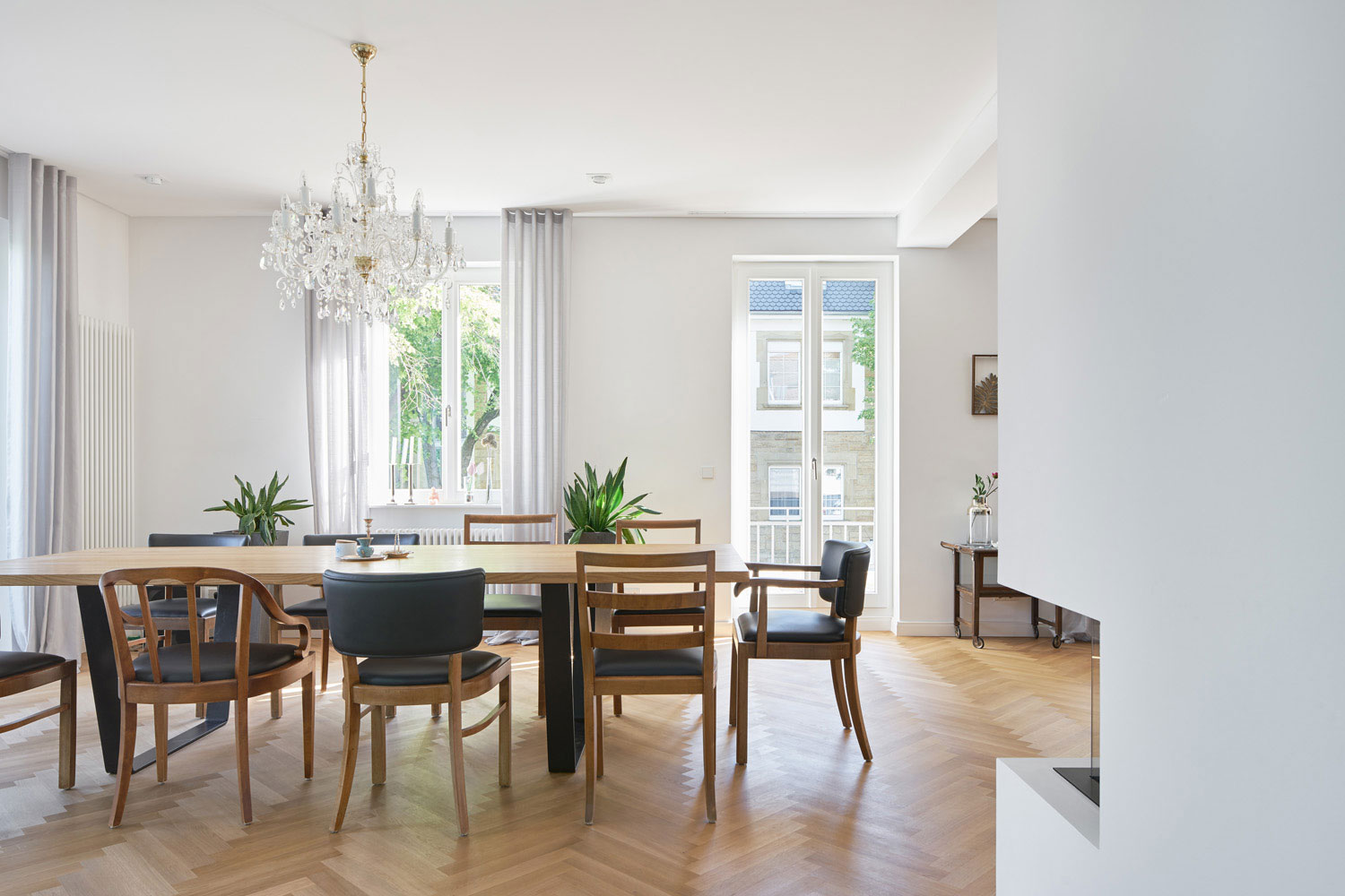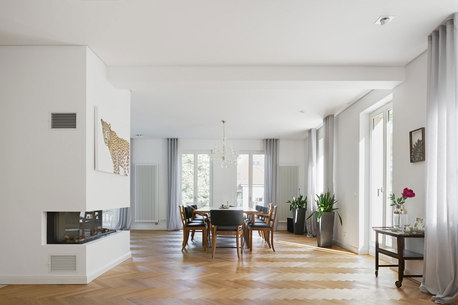 In den restlichen EG-Räumen haben wir einen neuen Eiche-Parkettboden im Fischgrat verlegen lassen, da der alte massive Feuchtschäden aufwies.