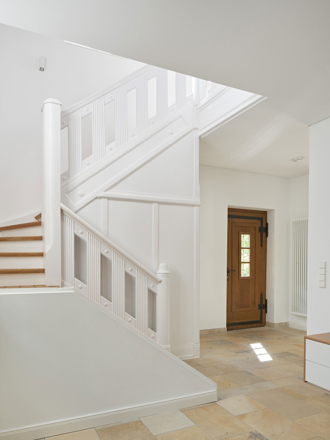 Im Erdgeschoss fanden wir im Eingangsbereich einen alten Natursteinbelag aus Solnhofer Kalkstein vor, den wir nur lokal ausbessern mussten. Das alte Material ist zum Glück auch heute noch erhältlich gewesen.