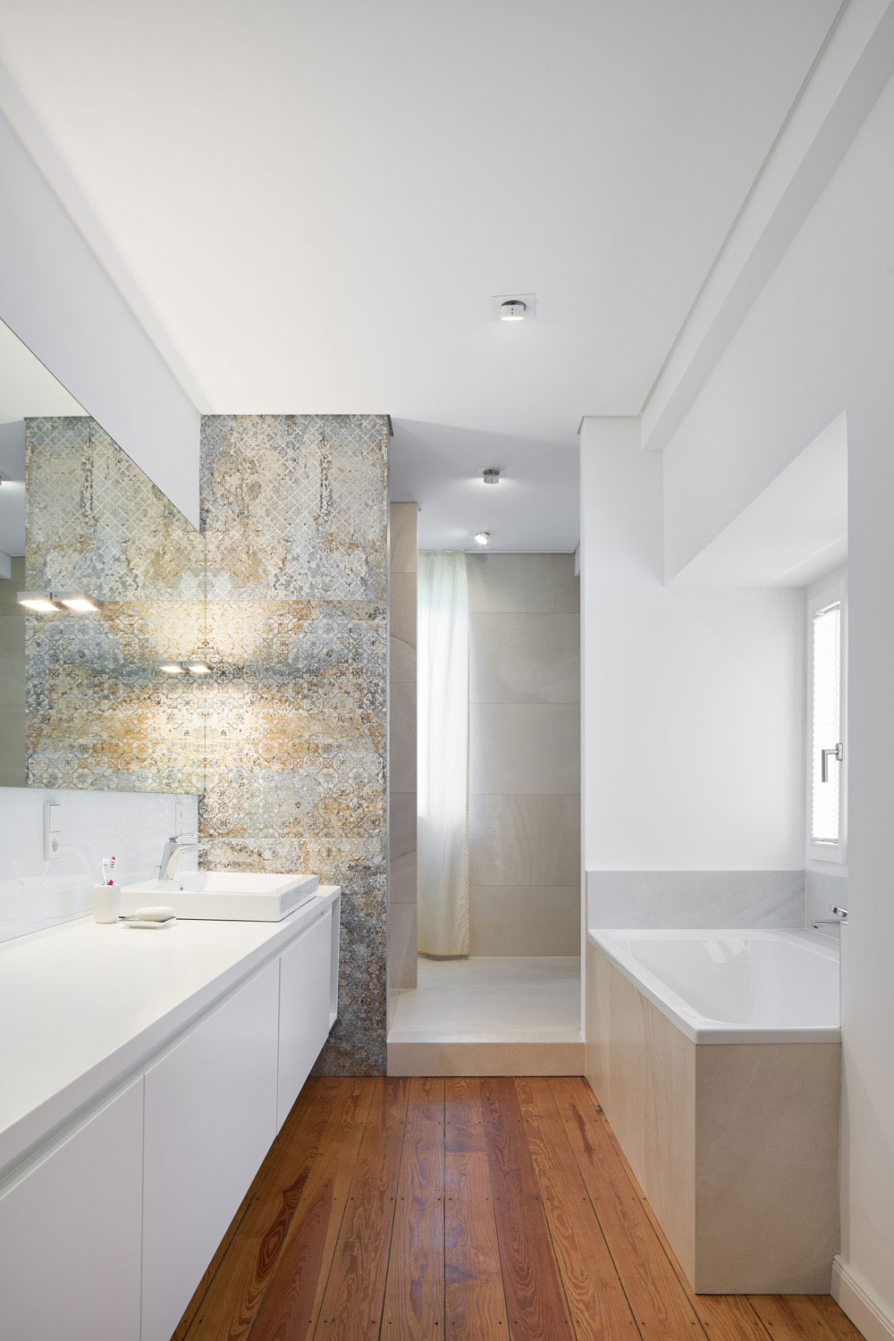 Im Obergeschoss konnten wir die alten Pichpine-Holzdielen sichern und aufarbeiten lassen. Türen und Holzwerk wurde erhalten, neue Türen als stumpf einschlagende Türblätter mit Blockzargen neu und erkennbar hinzugefügt.