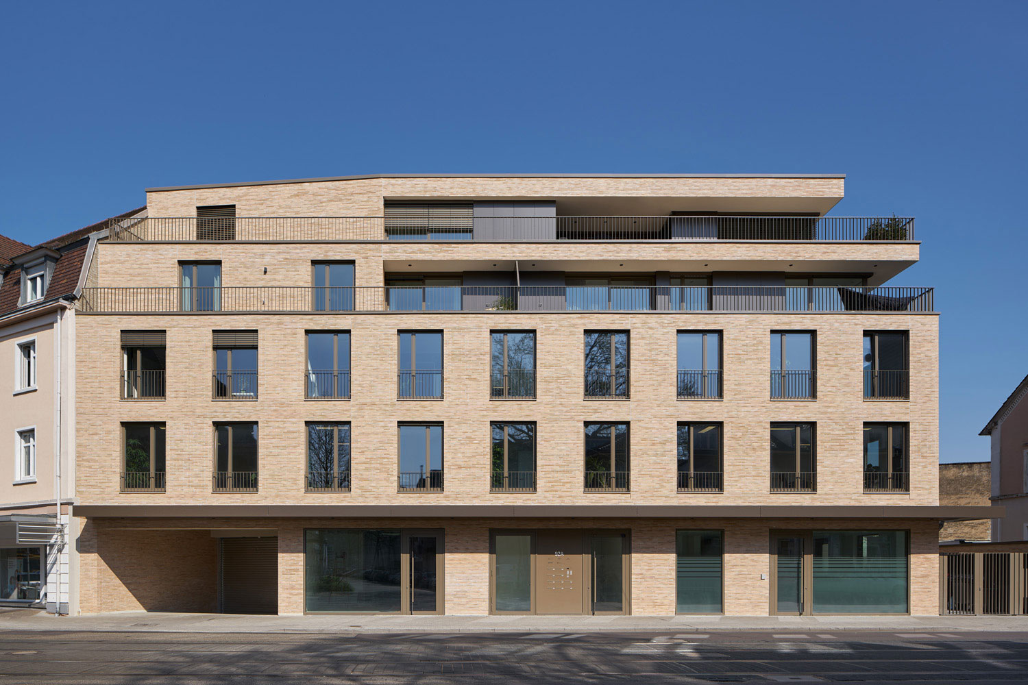Es entstand ein Stadtbaustein der sich städtebaulich in die Struktur und Körnung des Straßenzugs der Pfinztalstraße einfügt und die Lücke des Blockrands schließt. Die Gliederung der Fassade orientiert sich an der angrenzenden Gründerzeitfassade. Die Erdgeschosszone wird durch das durchlaufende Vordach betont, die Obergeschosse leben von der Ruhe der Wiederholung und dem ausgewogenen Verhältnis von Wand zu Öffnung, der Dachbereich staffelt sich unaufdringlich zurück. Das rückwärtige zweigeschossige Gebäude ist in seiner Materialität und Farbigkeit unterschiedlich zum Hauptbaukörper gestaltet, um dem Ensemble die Wucht zu nehmen und den Schwerpunkt auf das Klinkergebäude zu setzen. Die Farbe des Klinkers ist in Anlehnung des gelben Sandsteins der Altbauten gewählt.