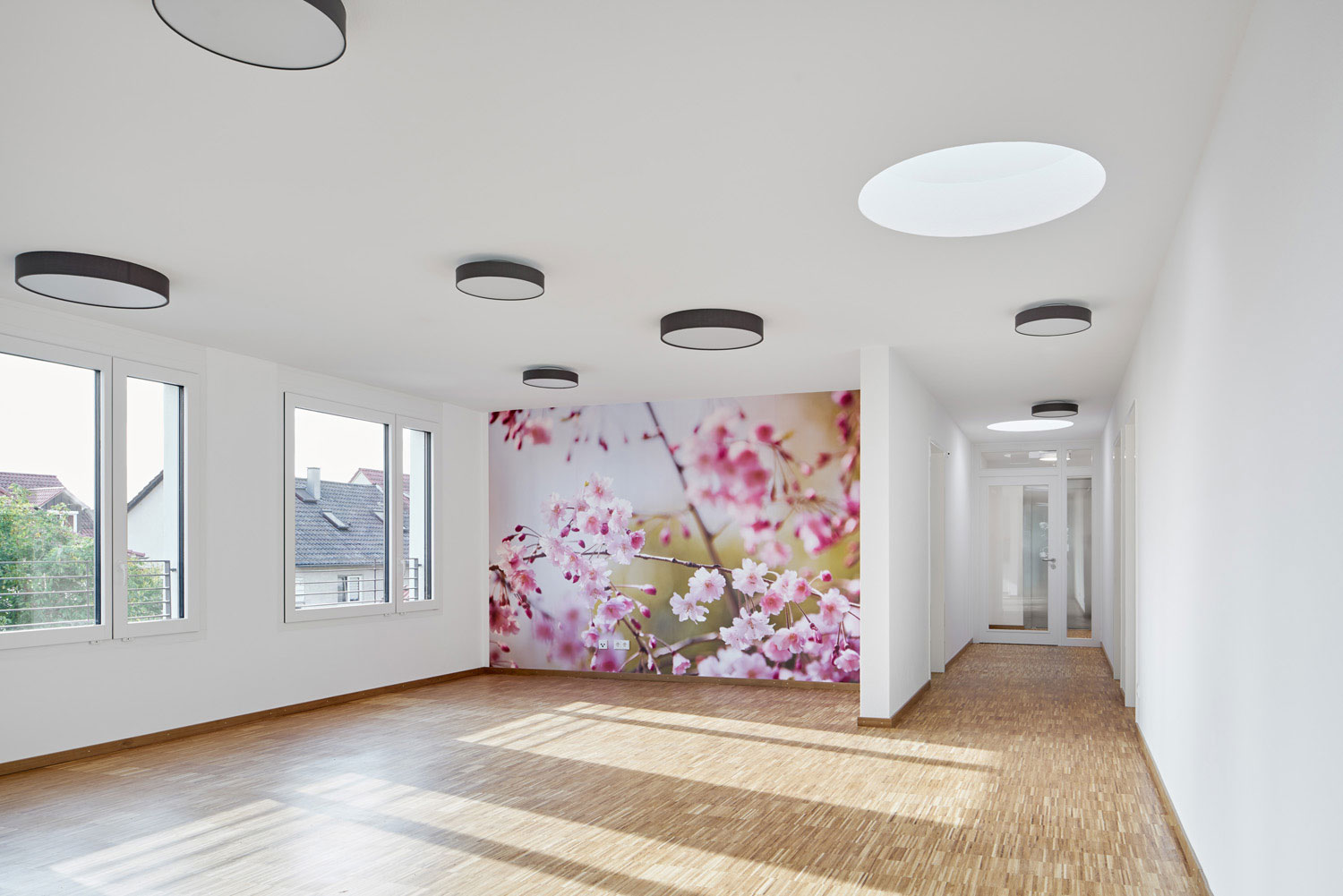 Wir haben hierfür ein dreigeschossiges Wohnheim mit 3 Wohngruppen mit jeweils 8 Ein- und Zweizimmer-Einheiten mit großzügigen Gemeinschaftsflächen auf dem bestehenden Standort, in zweiter Reihe, entworfen, geplant und gebaut. Jedes der 24 Bewohnerzimmer verfügt über ein Ensuite-Bad und eine hotelähnliche Ausstattung. Die Fenster sind mit einer niederen Brüstung errichtet, um den Bezug in den parkähnlichen Garten auch aus sitzender oder liegender Position zu ermöglichen. Selbstverständlich ist die gesamte Anlage barrierefrei ausgestattet.