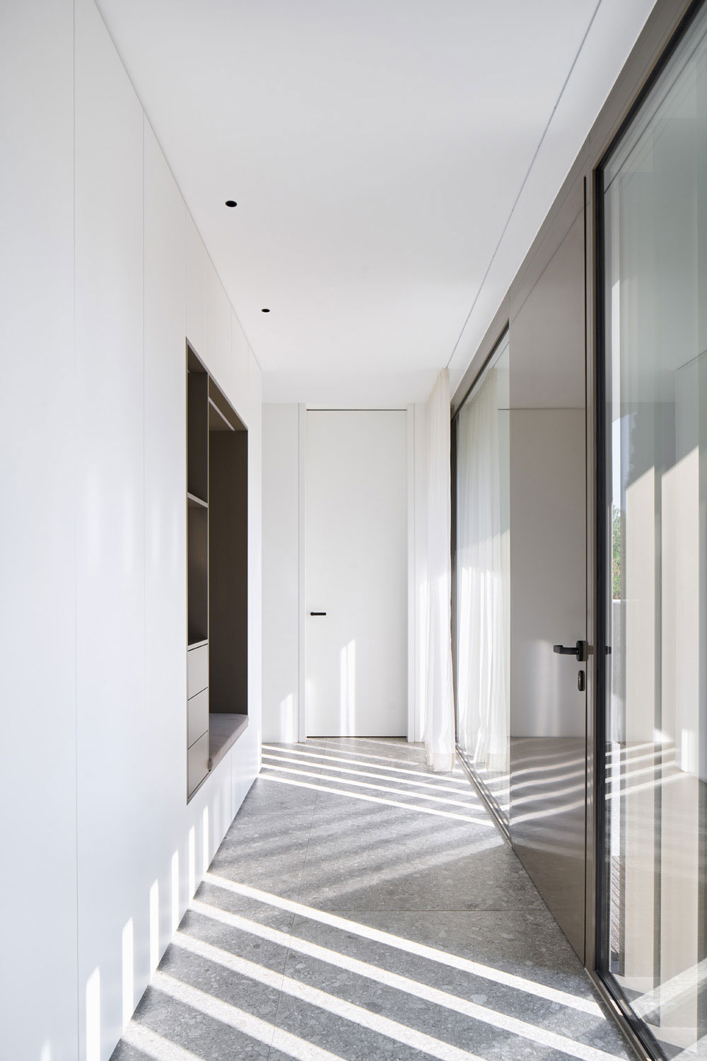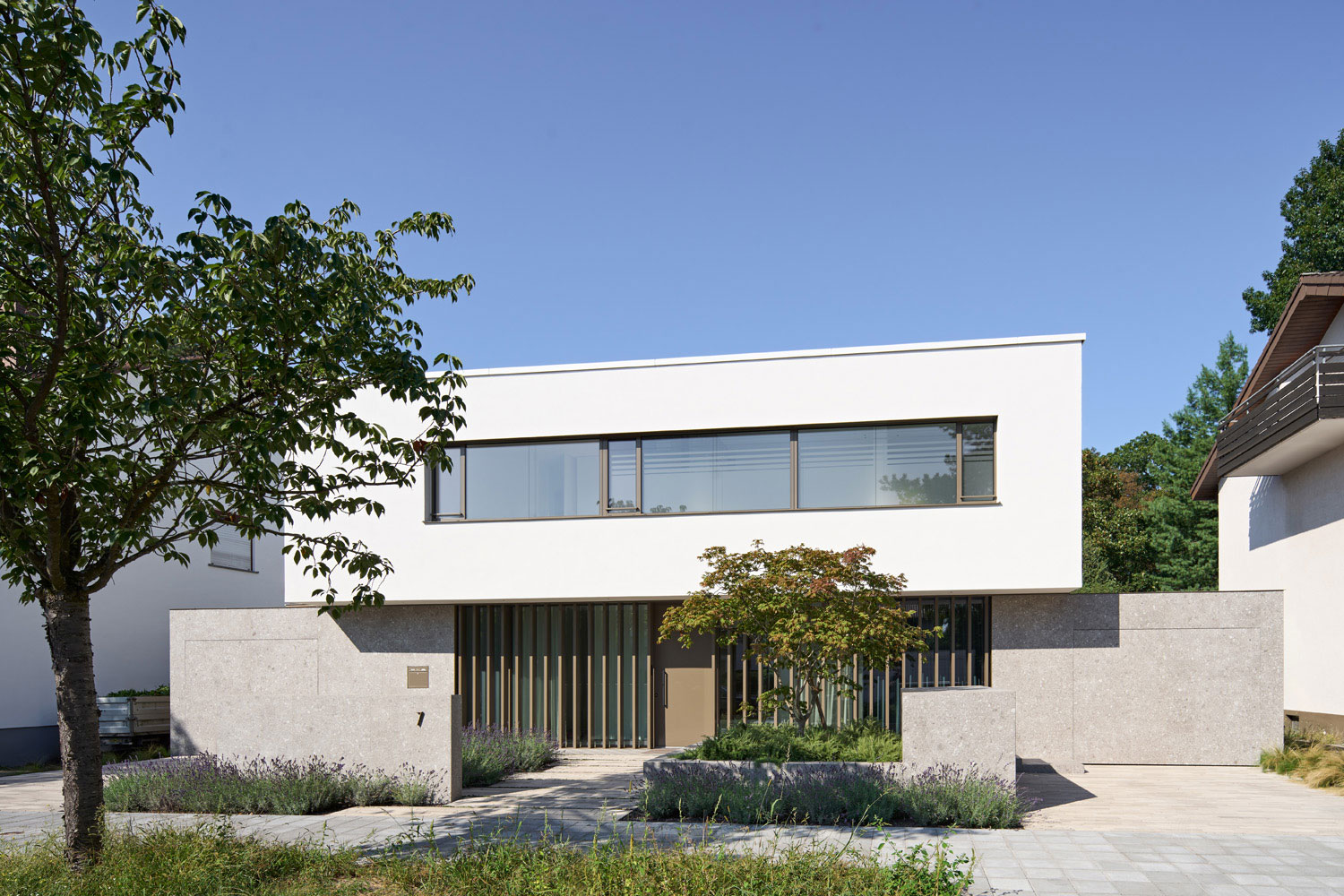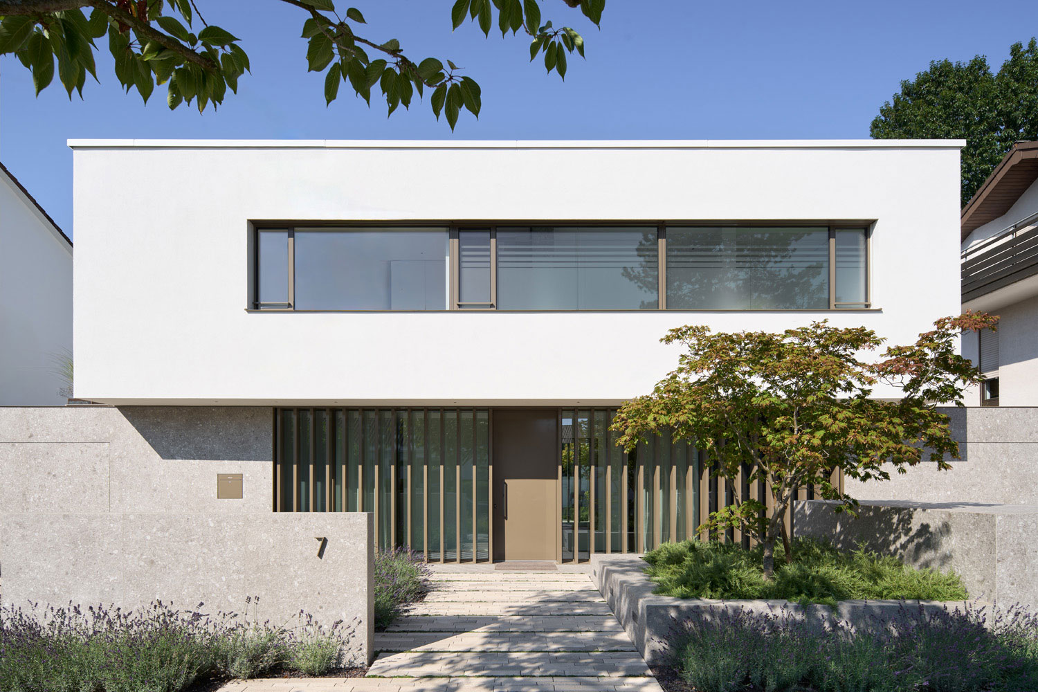 Farblich auf den Stein abgestimmte Fensteranlagen aus Aluminium mit sehr schlanken Profilen, großen Glasflächen, bodengleichen Übergängen von innen nach außen, vermitteln großzügige Weite. Die einladende Verglasung am Eingang lässt Ein- und Durchblicke zu, die stehenden, tiefen Aluminiumlamellen schaffen andererseits auf einfachste Weise die nötige Privatheit.