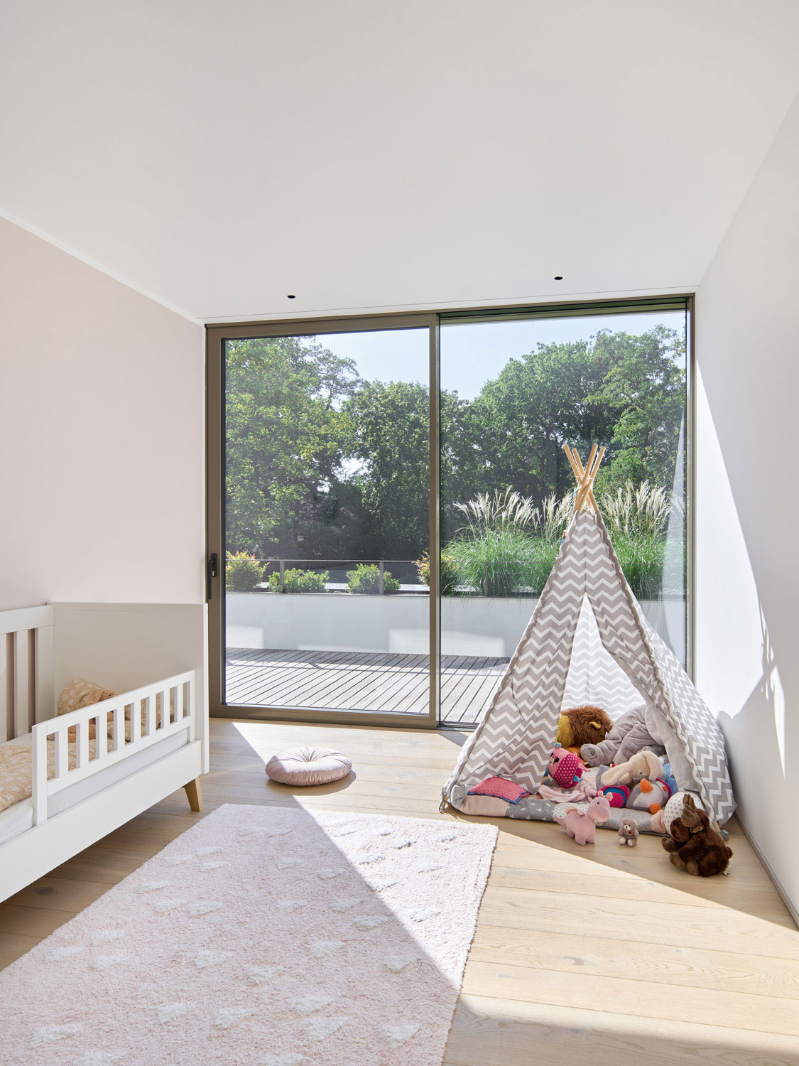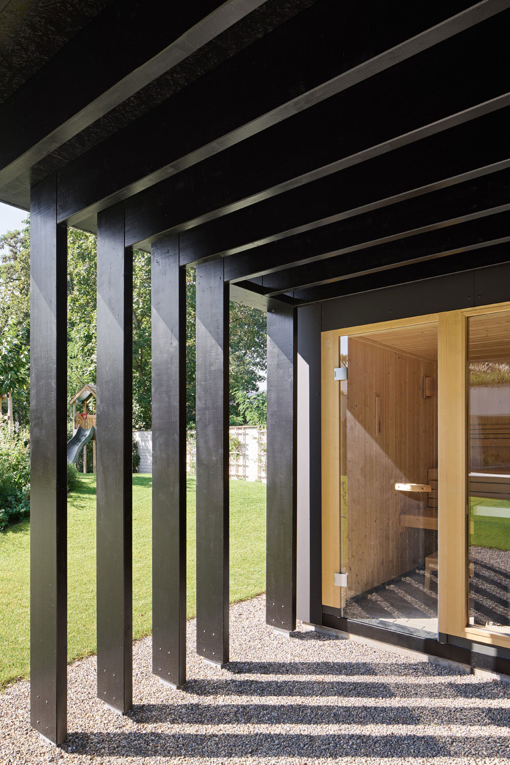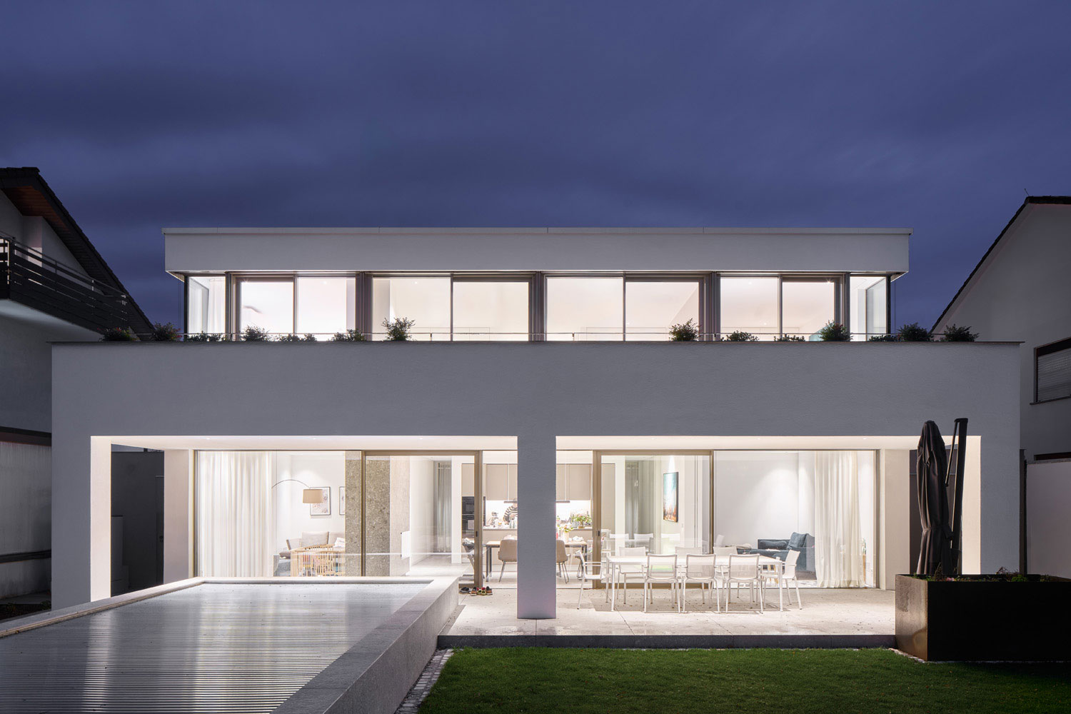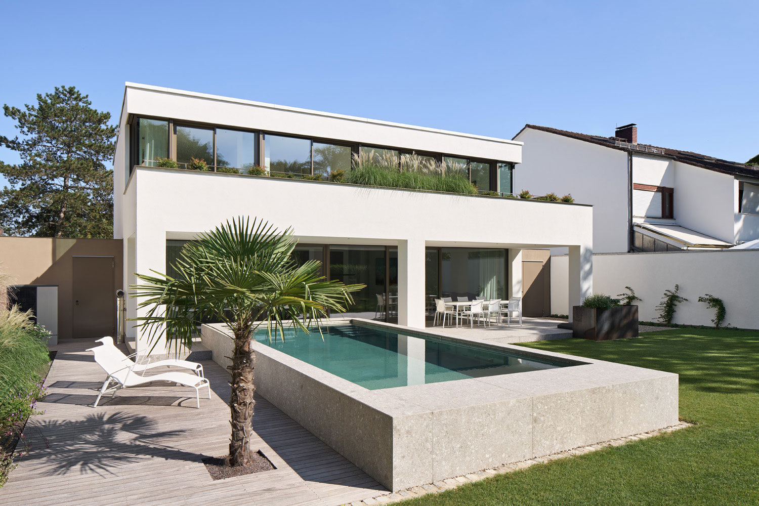 Auf der Gartenseite ist umgekehrt das Erdgeschoss vorspringend, sodass eine großzügige Dachterrasse für alle im Obergeschoss liegenden Schlafzimmer entsteht. Darunter liegt die wetter- und sonnengeschützte Gartenterrasse vom Hauptwohnbereich mit den Nutzungen Essen-Wohnen-Medien-Bibliothek. Die Terrasse stellt den Übergang zum Pool und Garten her.