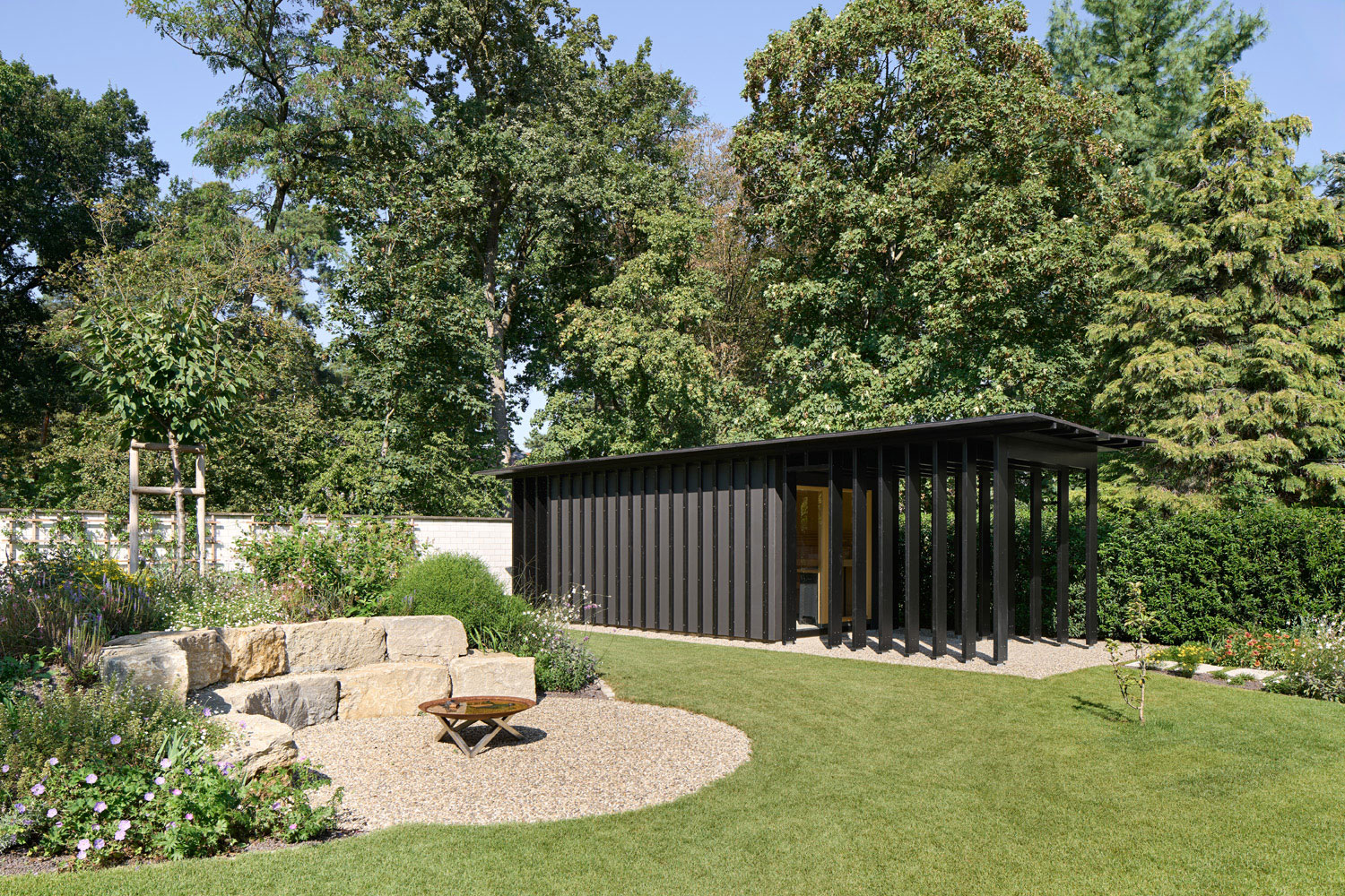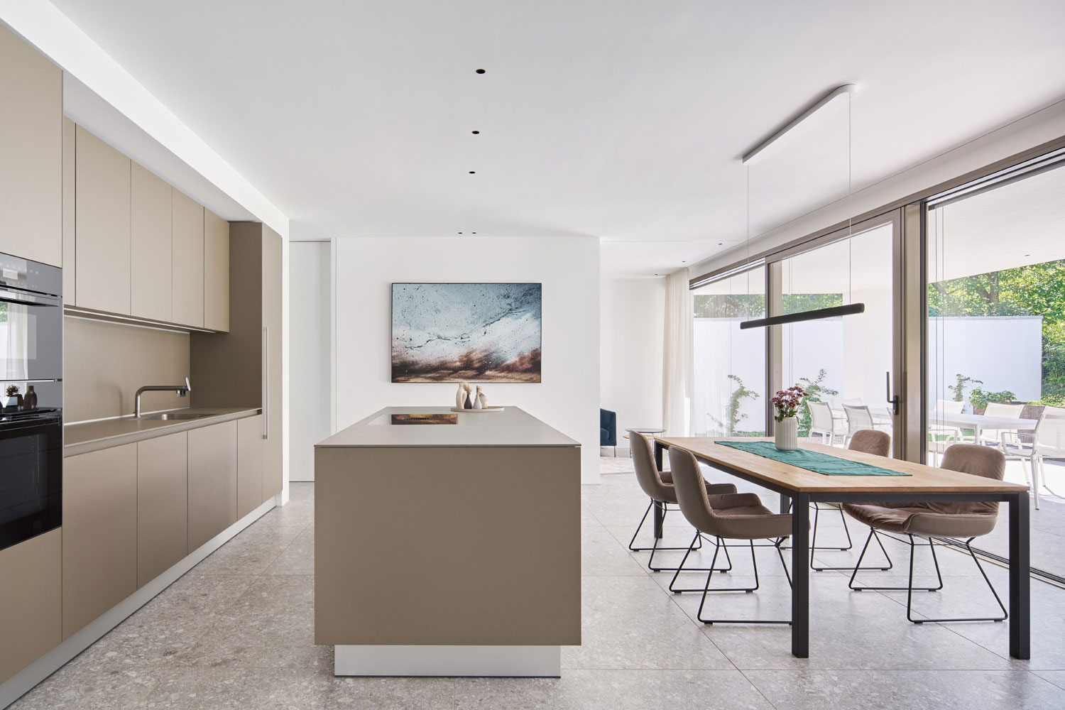 An den zentral gelegenen Koch-Essbereich, sind links und rechts der Medienraum und die Bibliothek angeordnet. Der holzbefeuerte Kamin dient als Raumteiler, der offene Raumeindruck bleibt jedoch durch die durchlaufende Glasfassade fließend. Vorgelagert gibt die große überdachte Terrasse den Blick in den Garten und Pool frei. Das Schwimmbecken mit umlaufenden Rand in Sitzhöhe lädt zum Verweilen am Wasser ein.