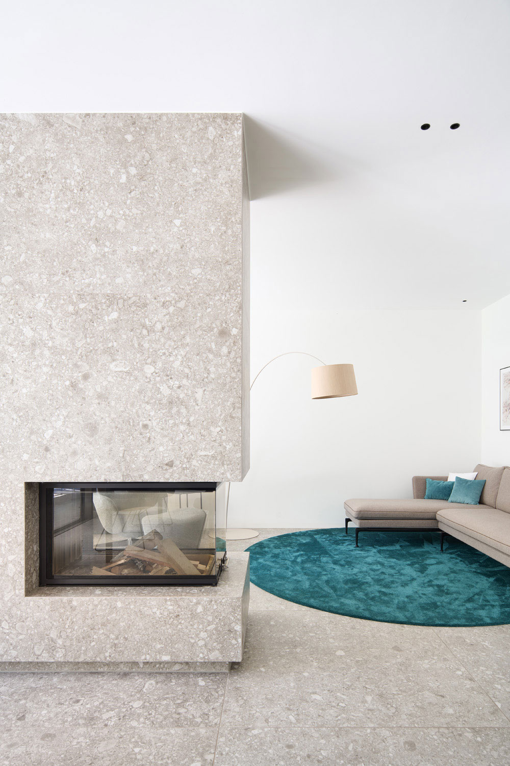 Die Reduzierung auf wenige, ausgewählte Materialien zeigt sich beispielhaft an der großformatigen Feinsteinzeugfliese. Diese findet sich an der Fassade, im Außenbereich als Terrassenbelag und Einfriedungen, im Innenbereich als Boden- und Wandbelag für Bäder und den offenen Kamin sowie als Oberfläche der Badmöbel. Der Fliese ist zeitlos elegant mit hoher Wertigkeit.