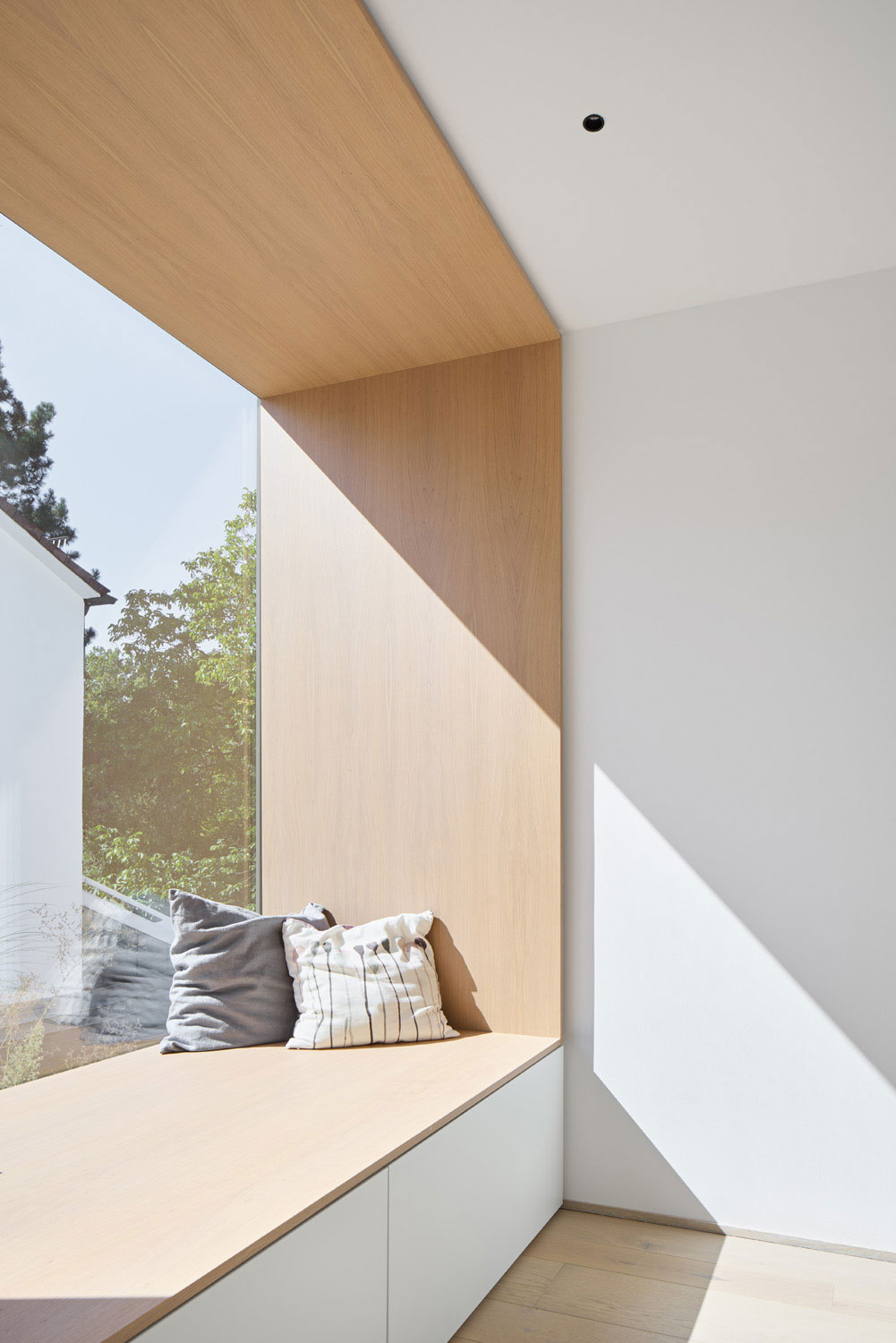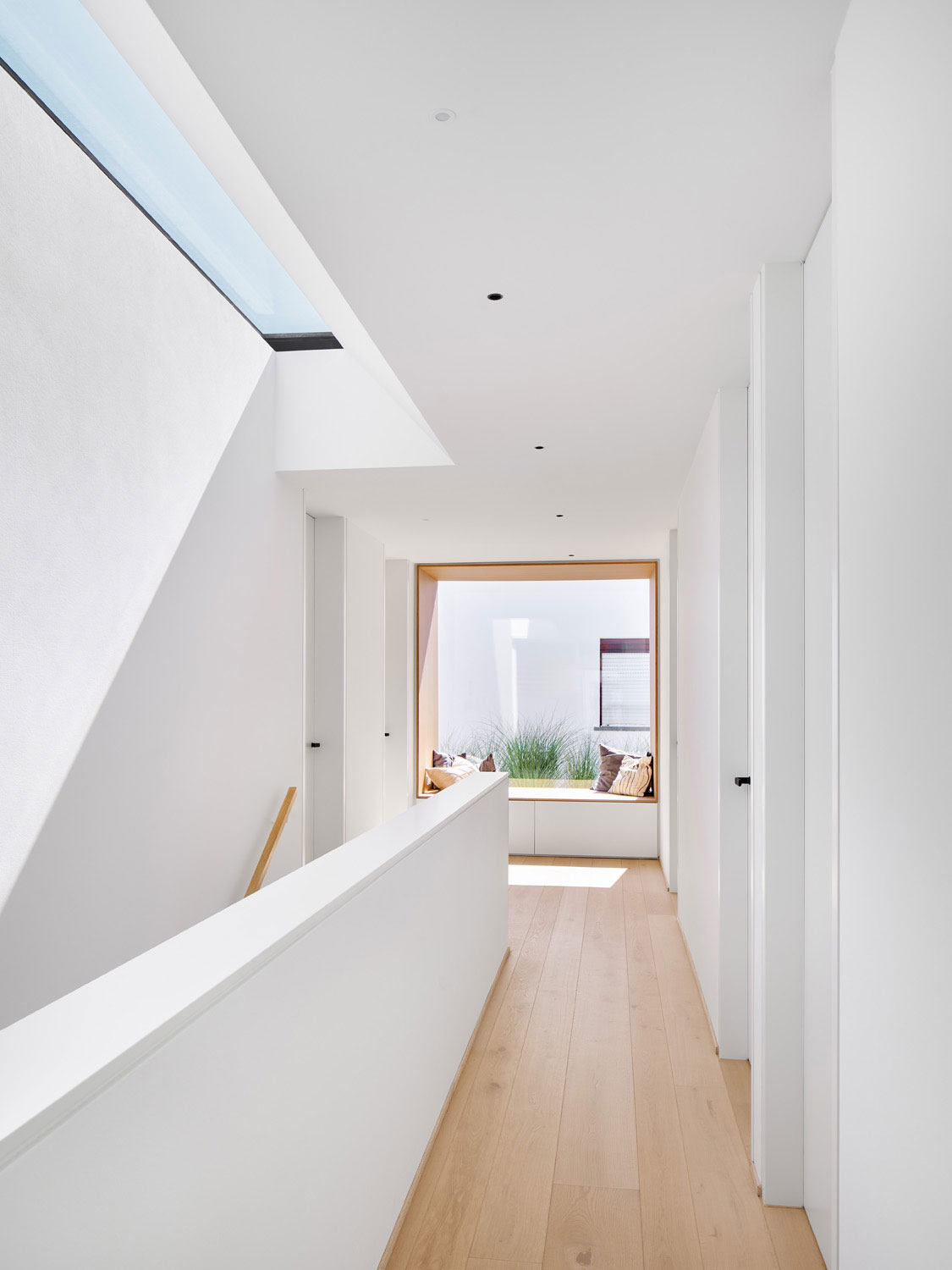 Im Obergeschoss besticht der verteilende Flur durch das Oberlicht und das große Sitzfenster am Ende des Raums. Im Weiteren sind die Privaträume der Familie angeordnet. Alle Möbel sind für dieses Haus angefertigt und passgenau integriert.