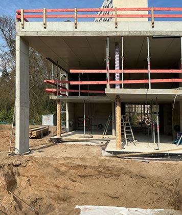 Der Rohbau des Wohnhauses G in der Karlsruher Waldstadt ist jetzt fertiggestellt. Aktuell finden die Betonierarbeiten am Pool statt.