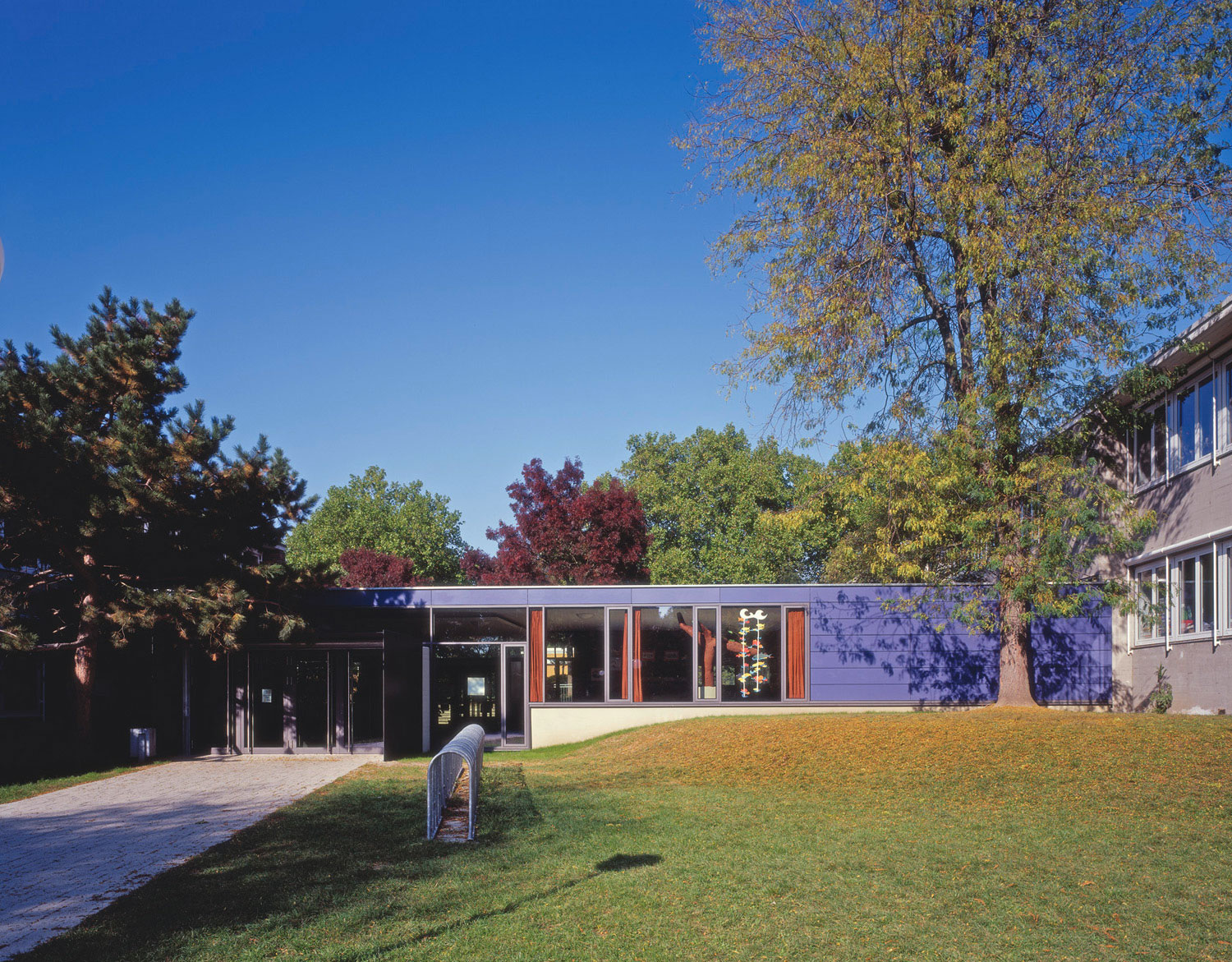 Ein vor die Eingänge gestellter Windfang aus massiven Stahlplatten markiert nun eindeutig den Haupteingang und dient gleichzeitig als Wetter- und Sauberlaufschleuse für die Kinder und Lehrer.