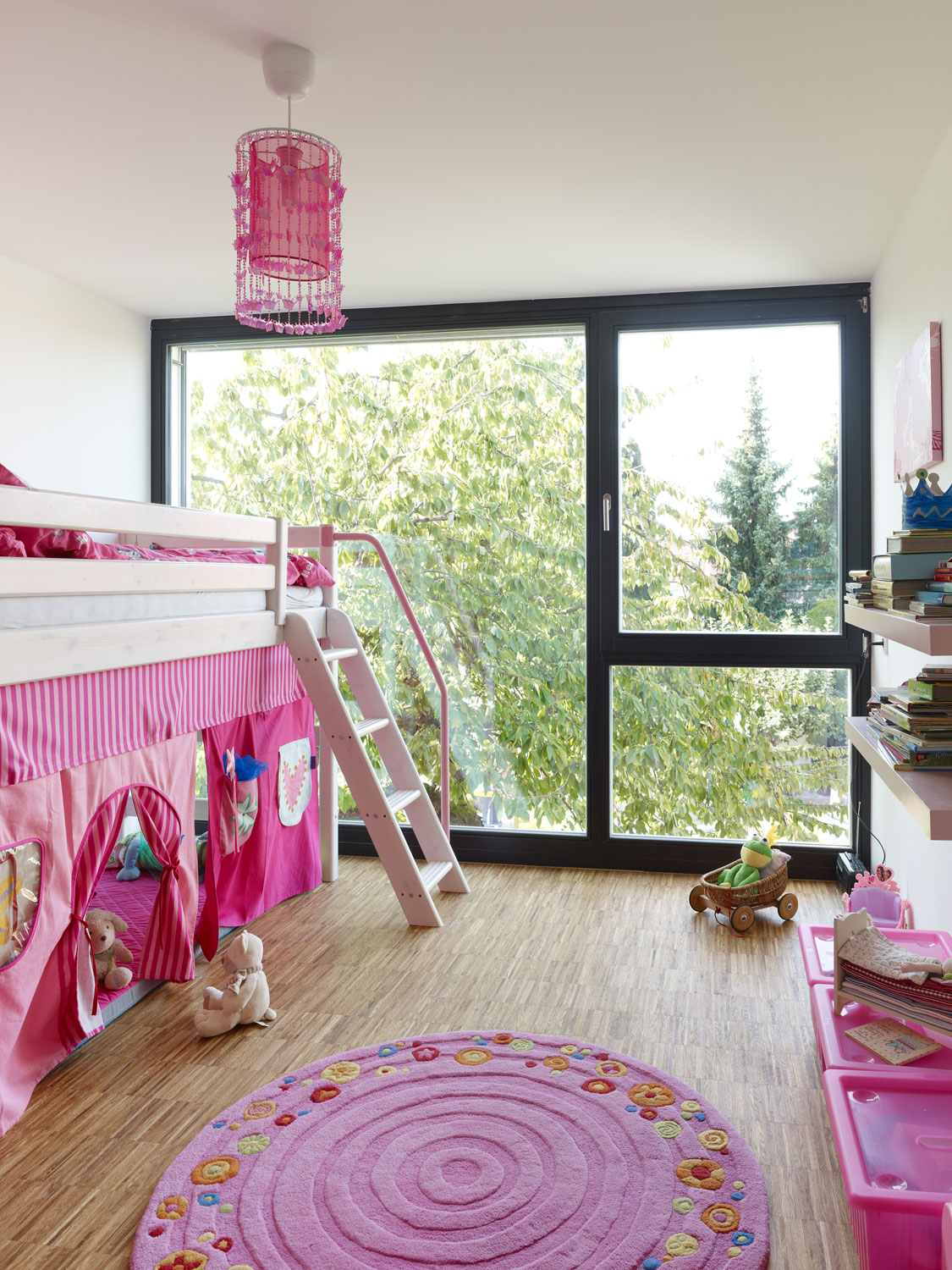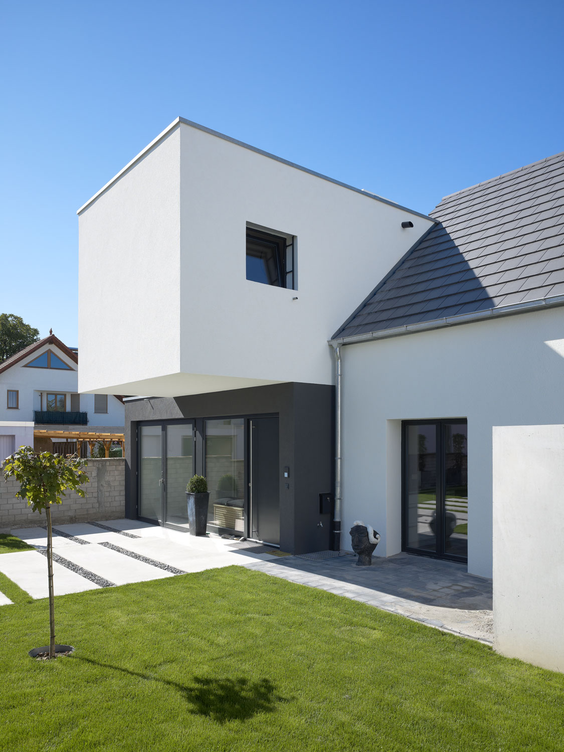 Der Neubau, in dem der Eingang, ein Atelier, die Bäder und die Schlafzimmer untergebracht wurden, ist mit großzügigen Verglasungen zum Hof bzw. zum schönen Garten hin ausgerichtet. Die Kinder können vom Kinderzimmer fast die Kirschen des davorstehenden Kirschbaums pflücken, sie wohnen im wahrsten Sinne des Wortes im Grünen.