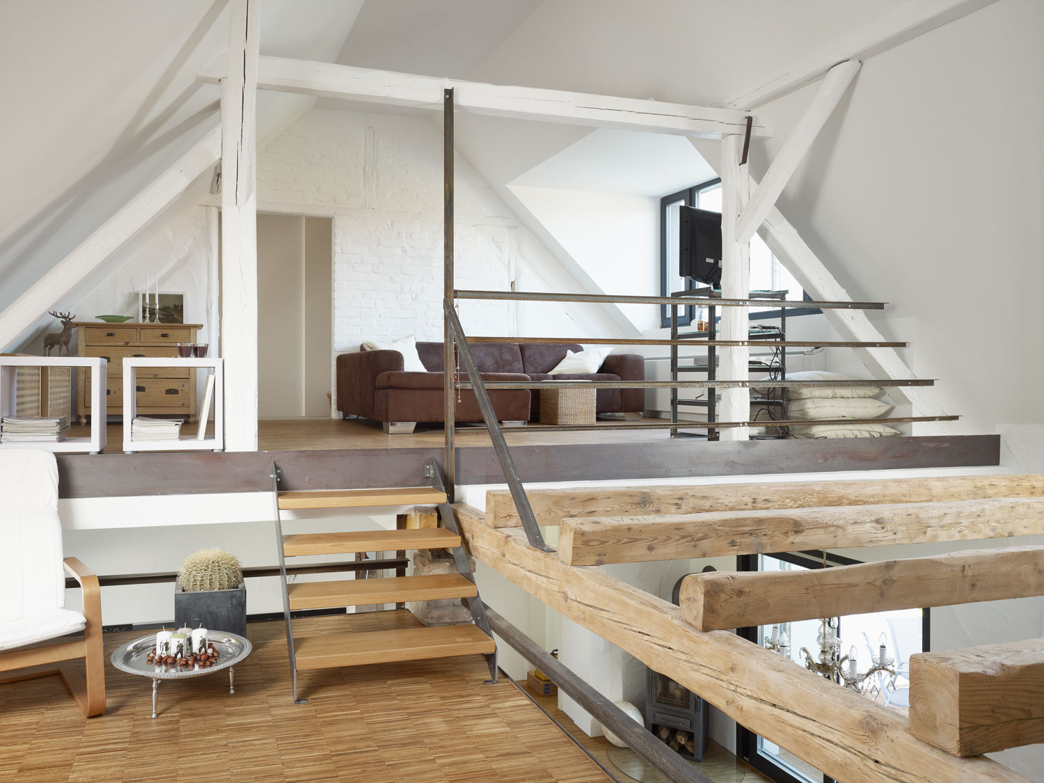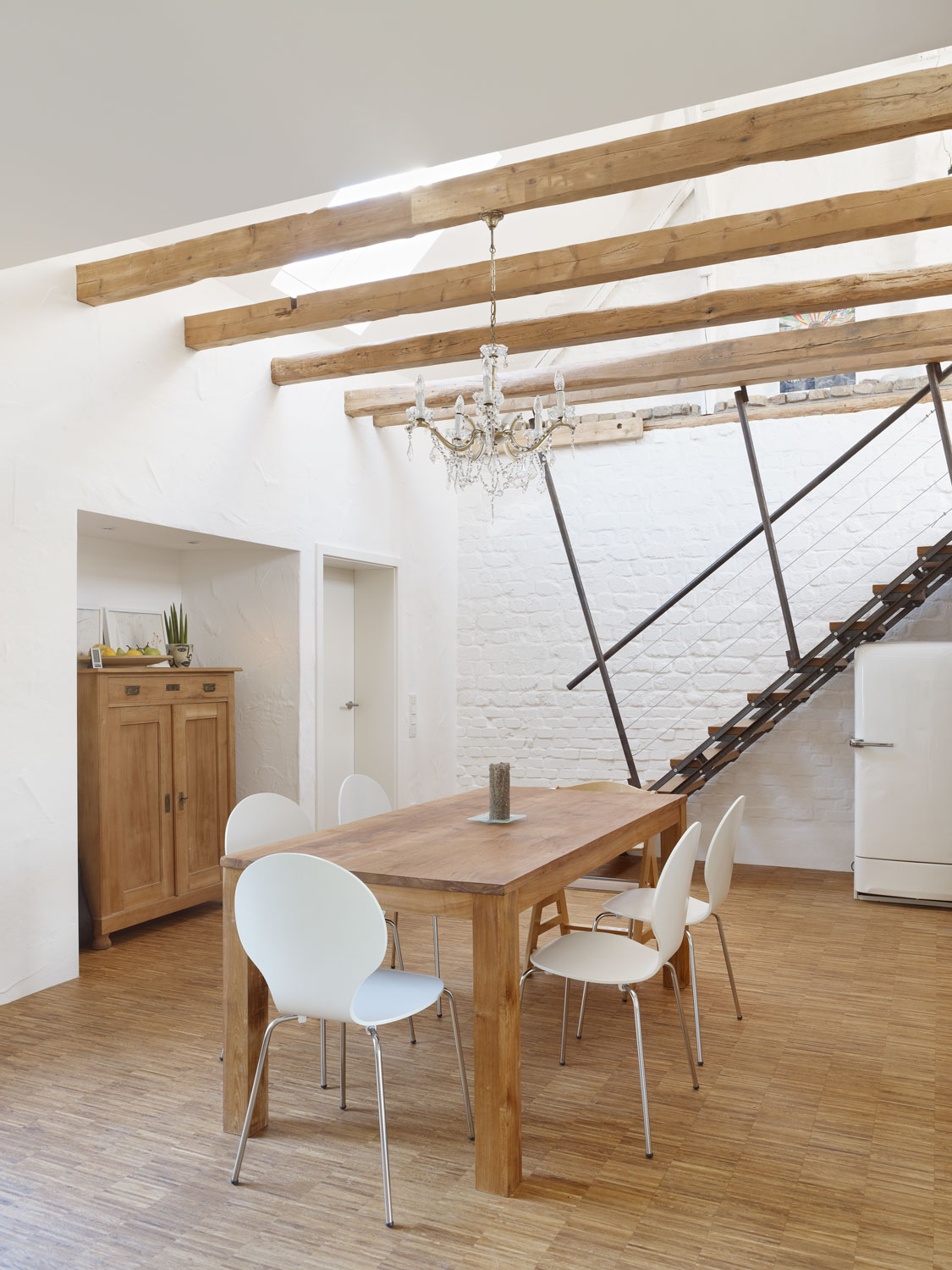 Im Innern wirkt die Scheune mit ihrer üppigen Raumhöhe, dem teilweise rohen und geschlämmten Backsteinmauerwerk und den alten Holzbalken noch sehr ursprünglich. Der durchgehende Industrieparkettboden auf Fußbodenheizung schafft Großzügigkeit trotz kleiner Flächen. Krumme Wände, Versätze im Mauerwerk, rohe Stahlteile sowie die Zwischenebene auf dem ehemaligen Saustall leisten ihren Teil, um den Räumlichkeiten Individualität zu geben. Durch die Reduzierung der Oberflächenfarben entsteht ein eleganter Gesamteindruck.